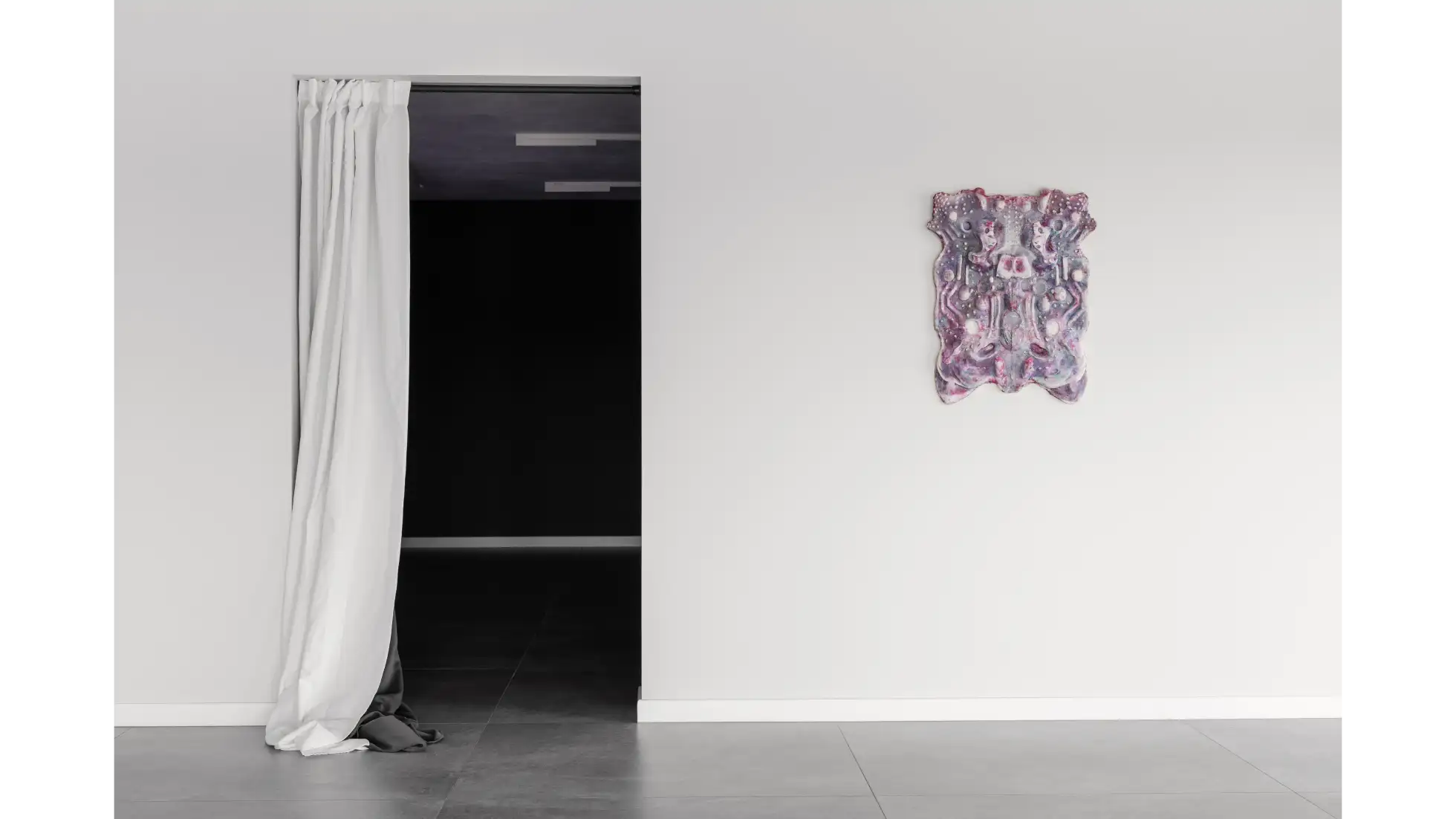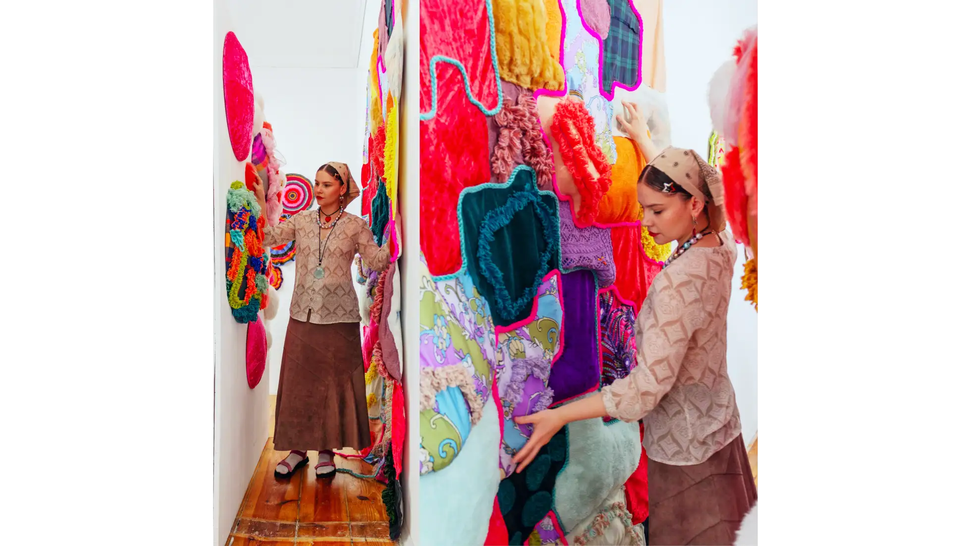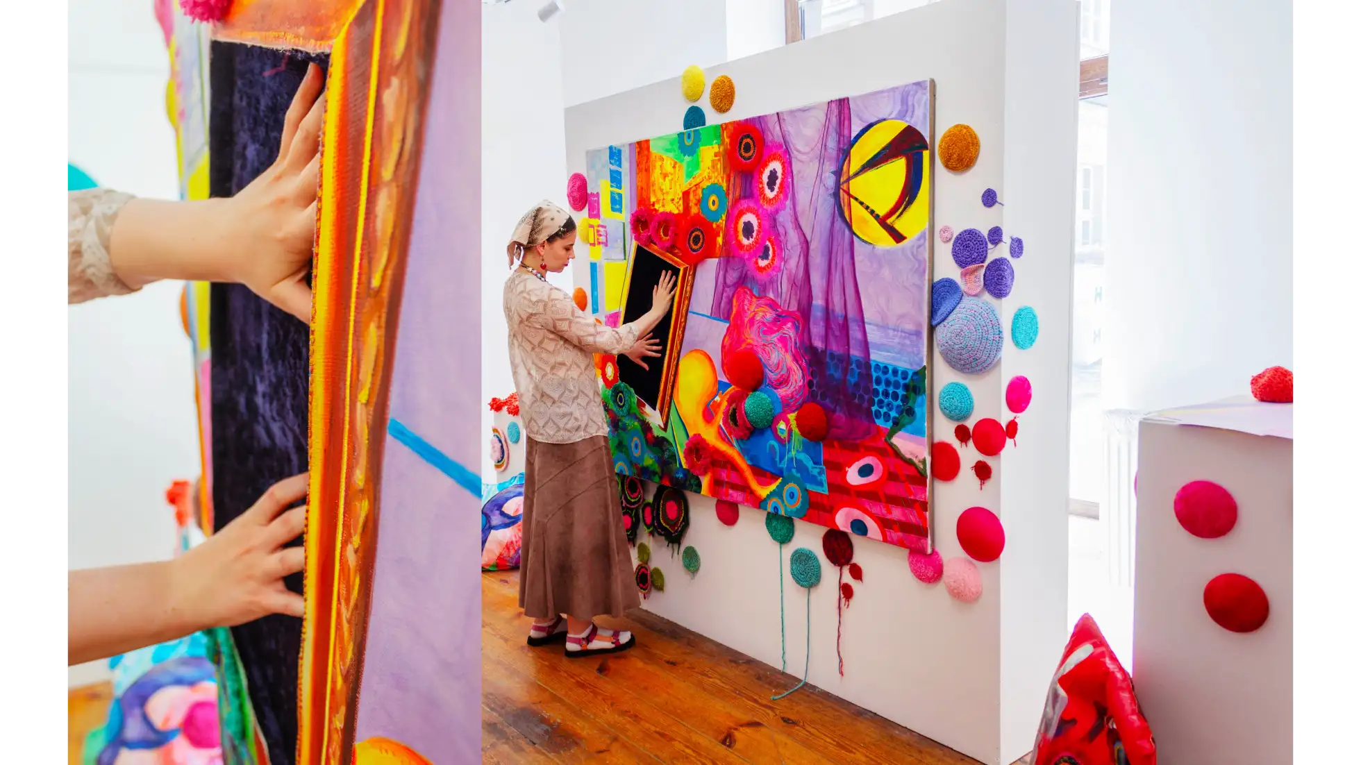 Ekspozycja składa się z trzech obrazów, łączących techniki malarskie, jak akryl i olej, z elementami tekstylnymi. Ich integralną częścią są koliste, wypukłe formy wykonane na szydełku, które tworzą organicznie rozszerzającą się strukturę. Przestrzeń dopełniają poduszki obciążeniowe, stworzone z fragmentów malowanych obrazów i wzbogacone szydełkowymi detalami, które odpowiadają na indywidualne potrzeby sensoryczne zwiedzających. Uzupełnieniem instalacji jest pokój wyciszeń, w którego centrum znajduje się styropianowa muszla, do której wnętrza można wejść i odpocząć. Otaczają ją miękkie, materiałowe formy, po których można chodzić, doświadczając sztuki nie tylko zmysłem dotyku, lecz również kinestetycznym.
