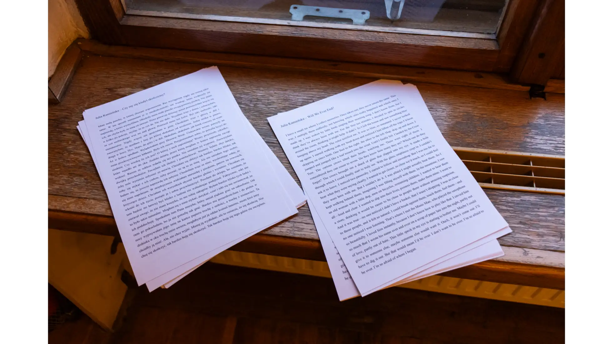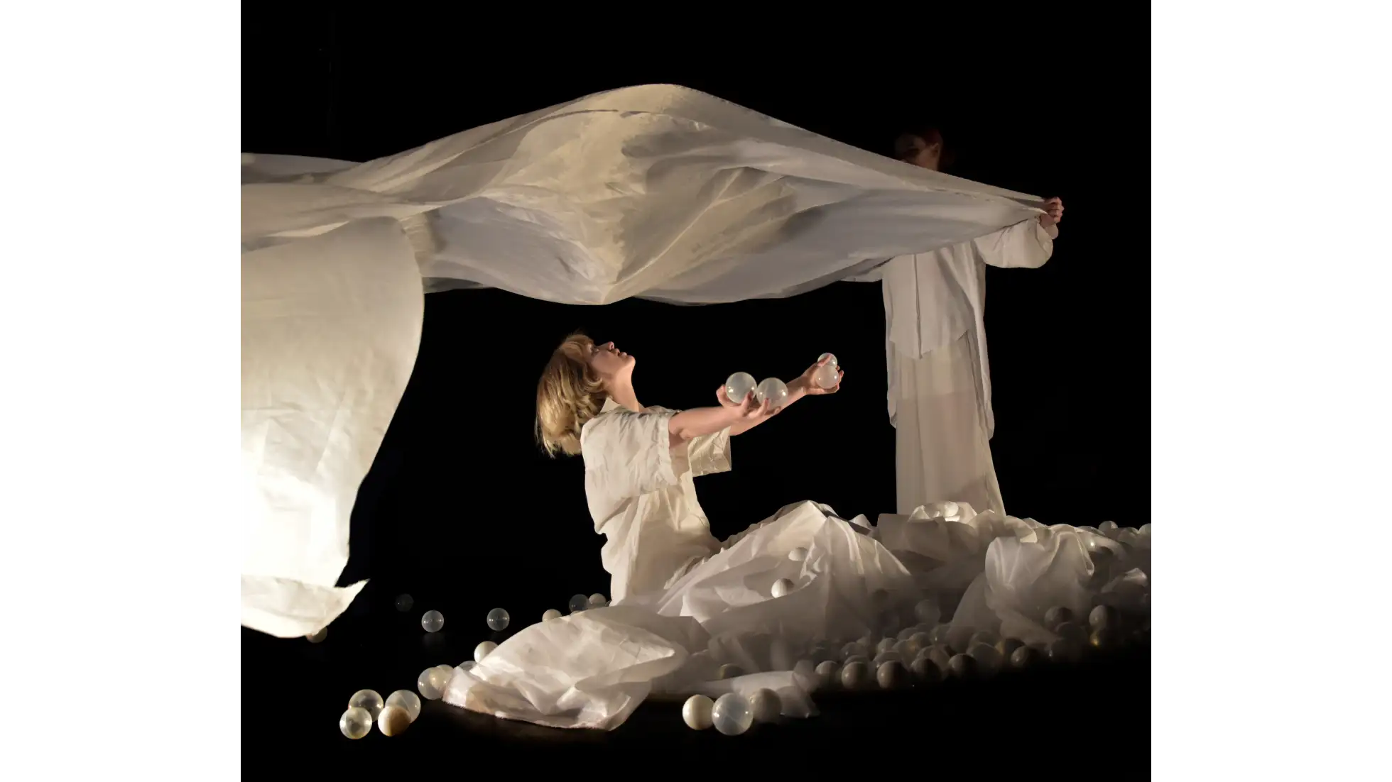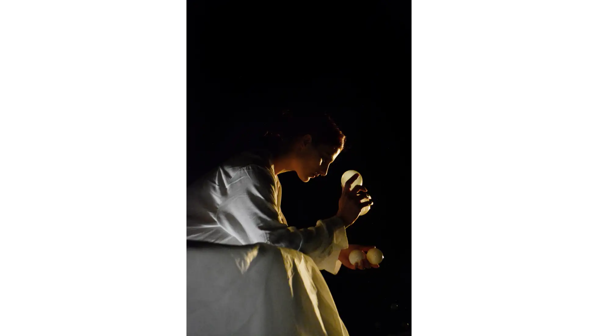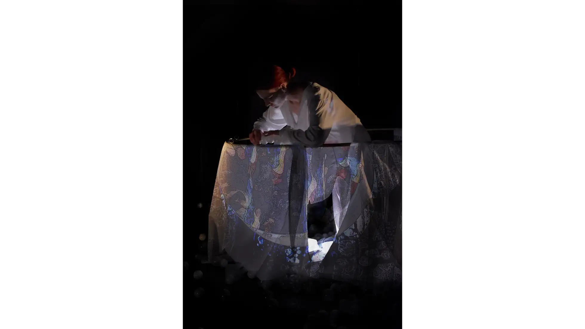 Projekt bada cielesny i zmysłowy wymiar słowa poprzez metaforę jedzenia. Spożywanie, przeżuwanie i połykanie słów staje się tu sposobem na bliski kontakt z tekstem oraz narzędziem budowania relacji z drugim człowiekiem. Czytanie, podobnie jak jedzenie, angażuje wiele zmysłów i wymaga aktywnego, zaangażowanego podmiotu. Obie czynności łączą w sobie polisensoryczność, wspólnotowość i indywidualne doświadczenie - mogą być darem, grą lub formą komunikacji. Słowo, podobnie jak posiłek, ma charakter materialny i emocjonalny, a jego odbiór pozwala na tworzenie więzi między wnętrzem a zewnętrzem, między tym, co wypowiedziane a tym, co ukryte. Punktem wyjścia dla części praktycznej projektu było stworzenie scenografii i jej ruchowej interpretacji, podkreślającej doświadczeniowy wymiar obcowania z tekstem. Performerki, wykorzystując gesty inspirowane codziennymi czynnościami – jak nakrywanie do stołu czy przygotowywanie posiłku - traktują słowo jako fizyczny element świata, który można przyjąć, oddać lub odrzucić. Forma przestrzenna, ruch, dźwięk i projekcje tworzą polisensoryczną narrację o wspólnym przeżywaniu języka. Zjadanie słów staje się tu metaforą uważności i bliskości - sposobem głębszego doświadczania świata oraz budowania relacji między ludźmi.
