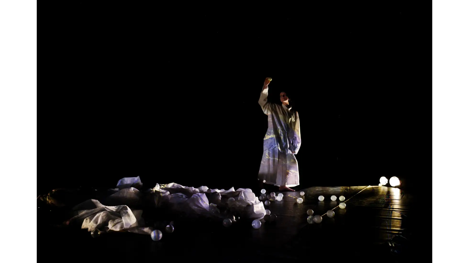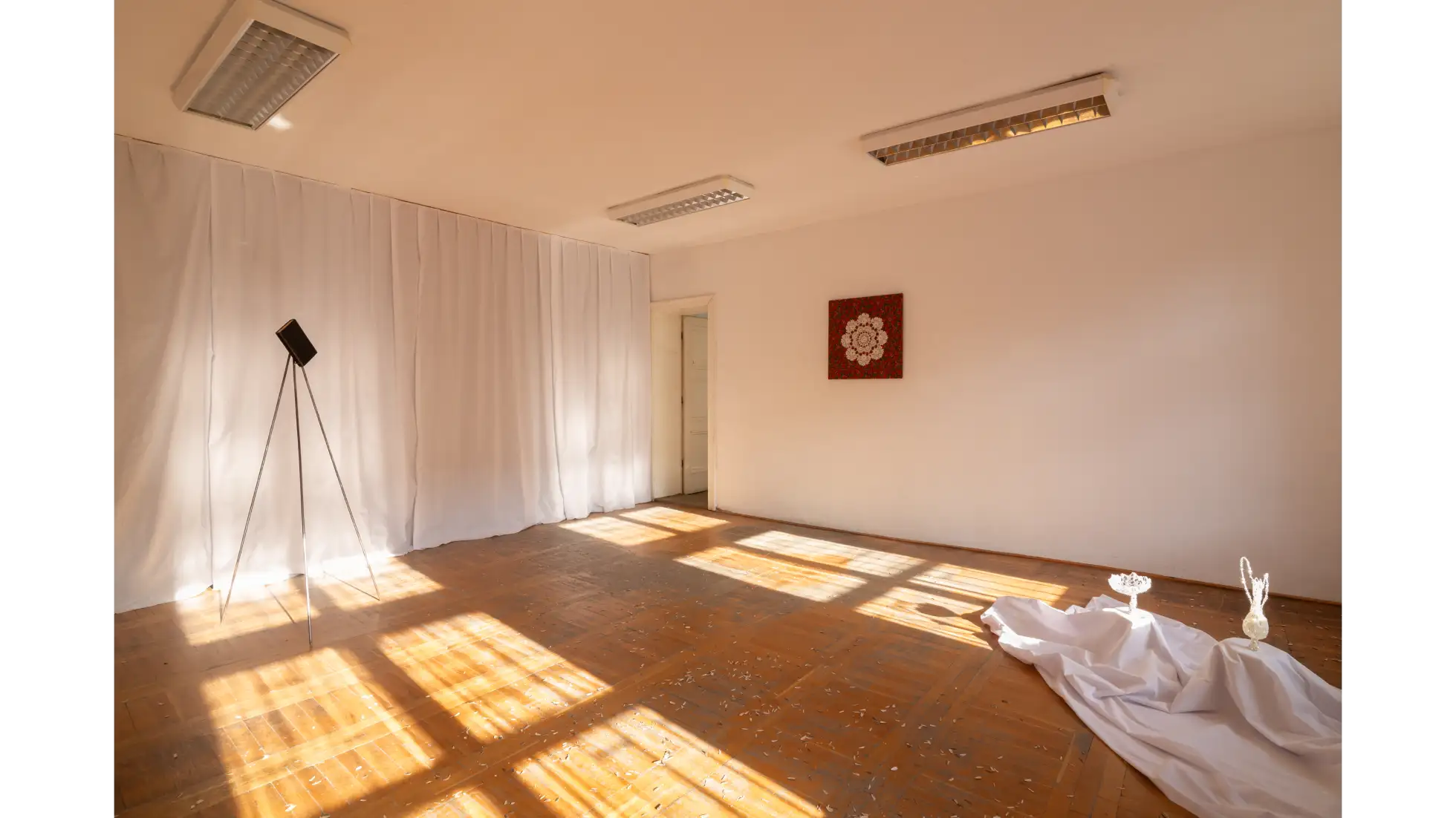 Praca eksploruje symbolikę światła i jego rolę w budowaniu relacji, wspólnoty oraz poczucia obecności. Światło nie jest już jedynie metaforą oświecenia, ale energią wyrastającą z samego bycia i współdzielenia przestrzeni. Instalacja pokazuje, że bliskość i obecność mogą ujawniać się właśnie poprzez światło. Traktuję je jako medium relacyjne, cielesne, aktywizujące całe ciało, a jednocześnie efemeryczne. Projekt składa się z trzech elementów. Dwukanałowa instalacja wideo przedstawia performans, w którym ciała performerów emitują światło, stając się jego źródłem i odbiorcami. Obiekt świetlny w formie pierścienia reaguje na dźwięki wydawane przez odbiorców, czyniąc ich aktywnymi współtwórcami doświadczenia. Trzeci element, instalacja site-specific, przepuszcza promienie słońca przez perforowaną tkaninę, materializując je i otwierając przestrzeń na grę między tym, co naturalne a sztuczne, obecne a nieobecne.