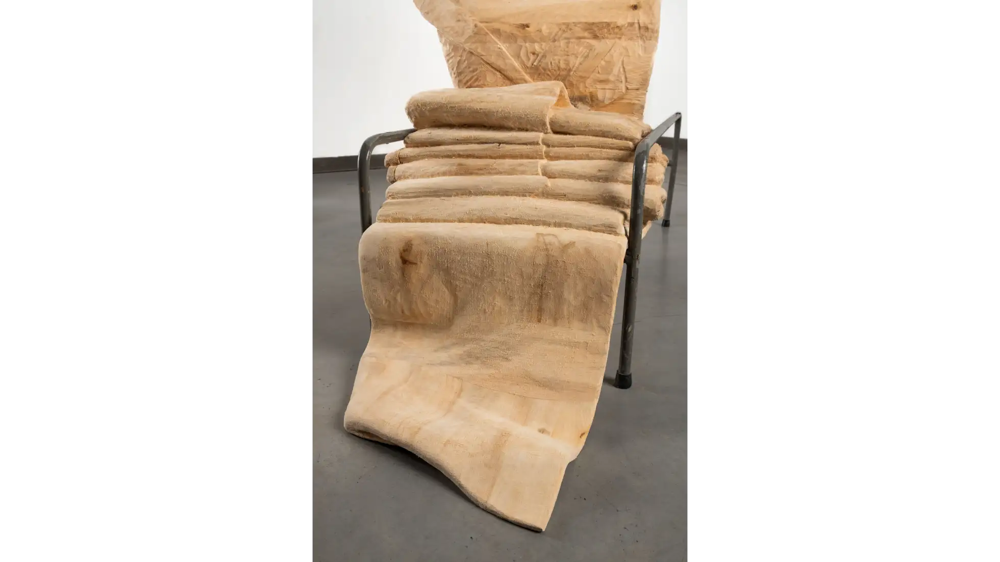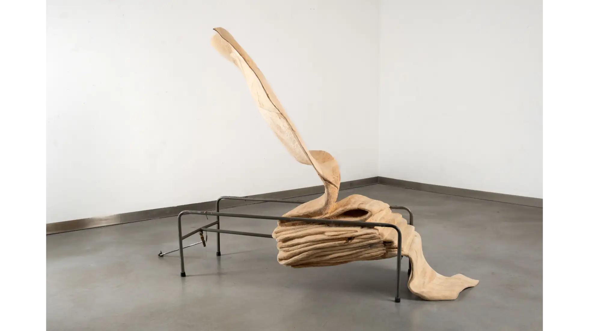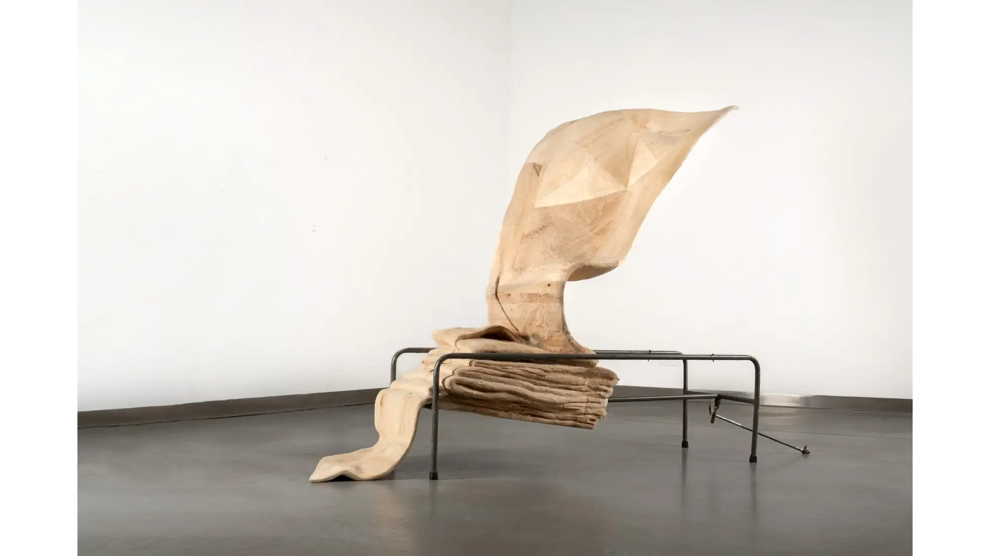 Rzeźba Wdech – Wydech. Powietrze jako spoiwo wszystkiego co żywe przedstawia poderwany przez wiatr materiał, wylewający się z ciasnego stelaża medycznego. Wprawne oko zauważy, że materia drewna “zmienia się” podążając za ruchem wiatru. W bliskości z ziemią, ciężka miękka fałda jest mechata - włóknistość drewna została podkreślona za pomocą specjalnej obróbki, co czyni ją być może bliższą tkaninie niż drewnu. Wyżej, już w stelażu, drewno było rzeźbione ekspresyjnie i niejako lekkomyślnie. Dalej, stopniowo unosząca się płachta już nie rwie się, nie włókni. Jest patchworkowa, twarda i lśniąca, ale coraz cieńsza. Jest coraz wyżej. Śledząc strukturę tej formy możemy dostrzec przenikanie się materii; raz przywołane cechy przynależą do tkaniny, a raz do drewna - przeplatając się, nie wykluczając. Podobne właściwości dotyczą życiowej energii qi zaklętej w powietrzu i ruchu, której pokrewne odpowiedniki występują w różnych miejscach na świecie i w historii; również w przypadku znaczeń przypisywanych wiatrowi; tak i podobne wrażenia wiążą się w byciu wobec i w oddechach innych. Formę tej pracy można odczytać jak palindrom, który nagle okaże się kręgiem życia.