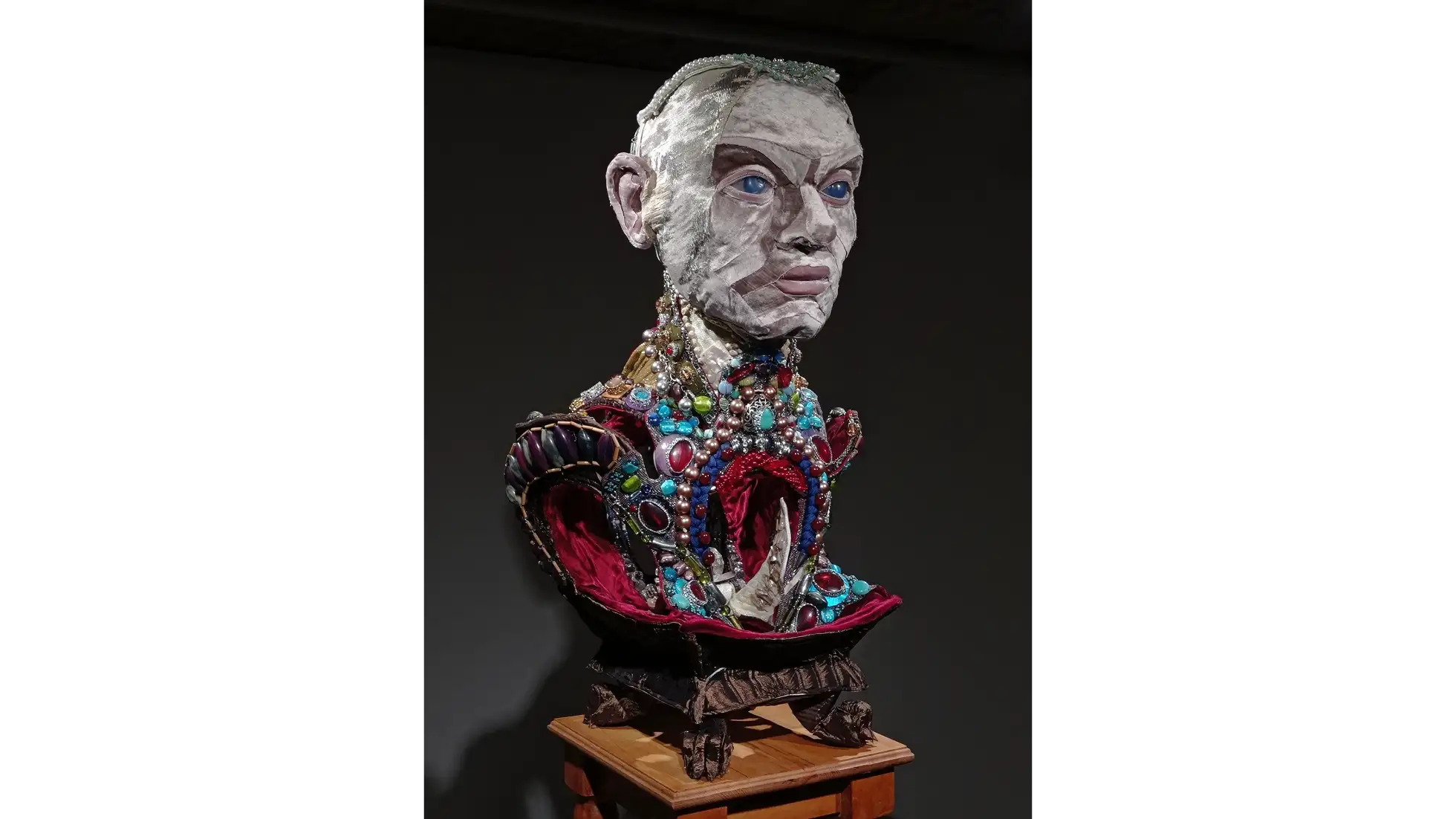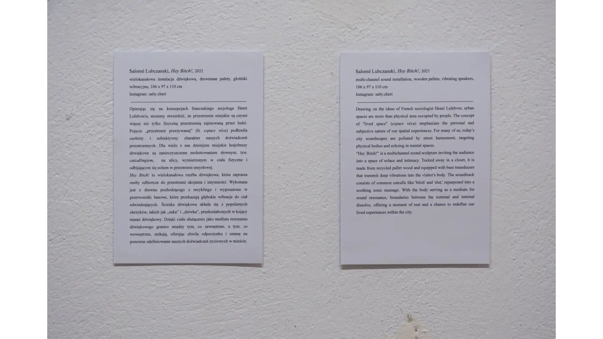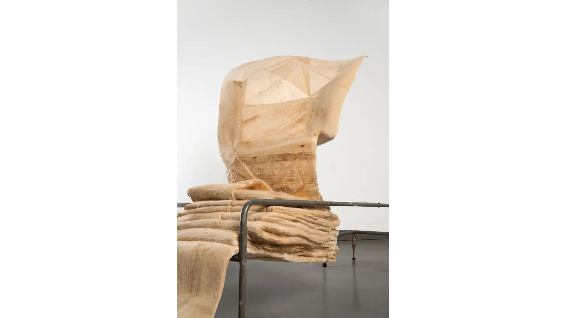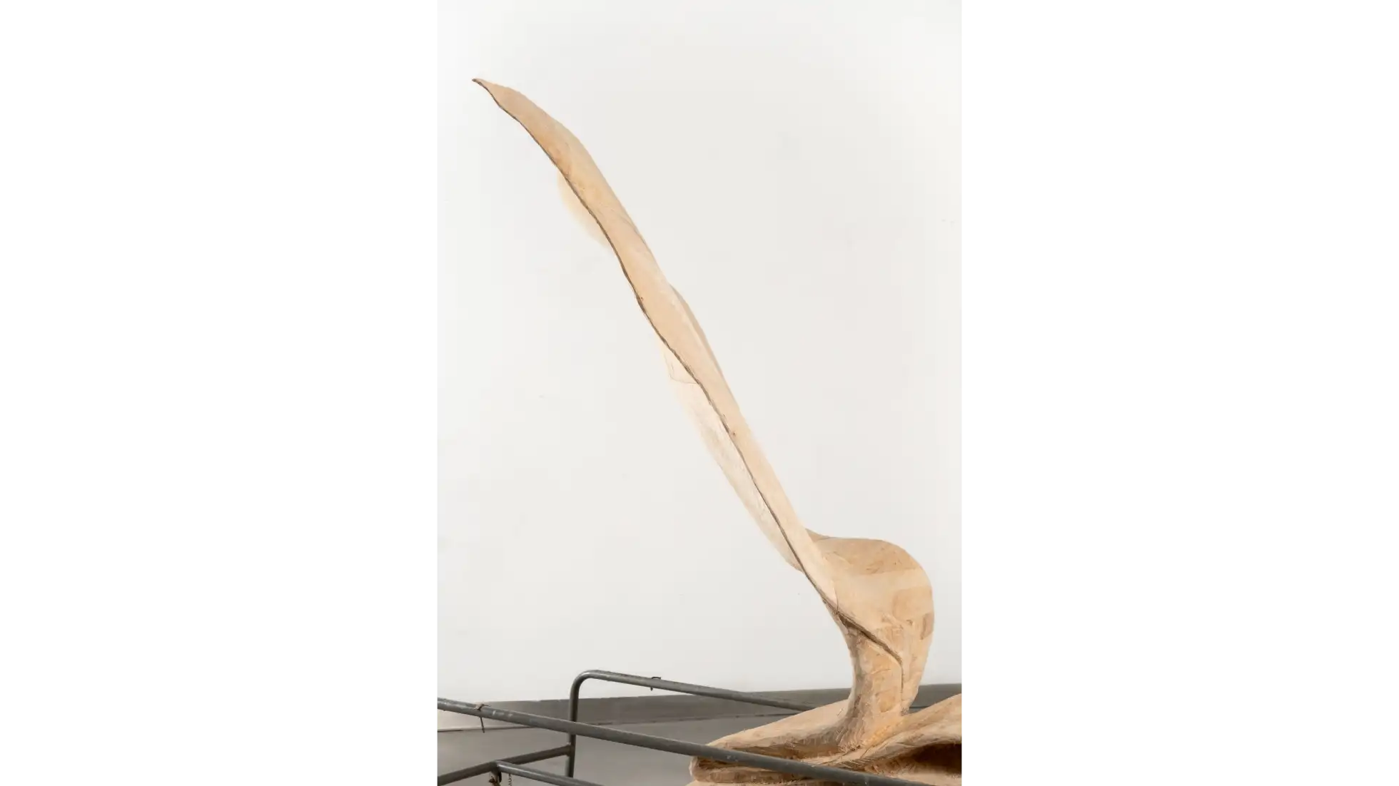 Rzeźba Wdech – Wydech. Powietrze jako spoiwo wszystkiego co żywe przedstawia poderwany przez wiatr materiał, wylewający się z ciasnego stelaża medycznego. Wprawne oko zauważy, że materia drewna “zmienia się” podążając za ruchem wiatru. W bliskości z ziemią, ciężka miękka fałda jest mechata - włóknistość drewna została podkreślona za pomocą specjalnej obróbki, co czyni ją być może bliższą tkaninie niż drewnu. Wyżej, już w stelażu, drewno było rzeźbione ekspresyjnie i niejako lekkomyślnie. Dalej, stopniowo unosząca się płachta już nie rwie się, nie włókni. Jest patchworkowa, twarda i lśniąca, ale coraz cieńsza. Jest coraz wyżej. Śledząc strukturę tej formy możemy dostrzec przenikanie się materii; raz przywołane cechy przynależą do tkaniny, a raz do drewna - przeplatając się, nie wykluczając. Podobne właściwości dotyczą życiowej energii qi zaklętej w powietrzu i ruchu, której pokrewne odpowiedniki występują w różnych miejscach na świecie i w historii; również w przypadku znaczeń przypisywanych wiatrowi; tak i podobne wrażenia wiążą się w byciu wobec i w oddechach innych. Formę tej pracy można odczytać jak palindrom, który nagle okaże się kręgiem życia.