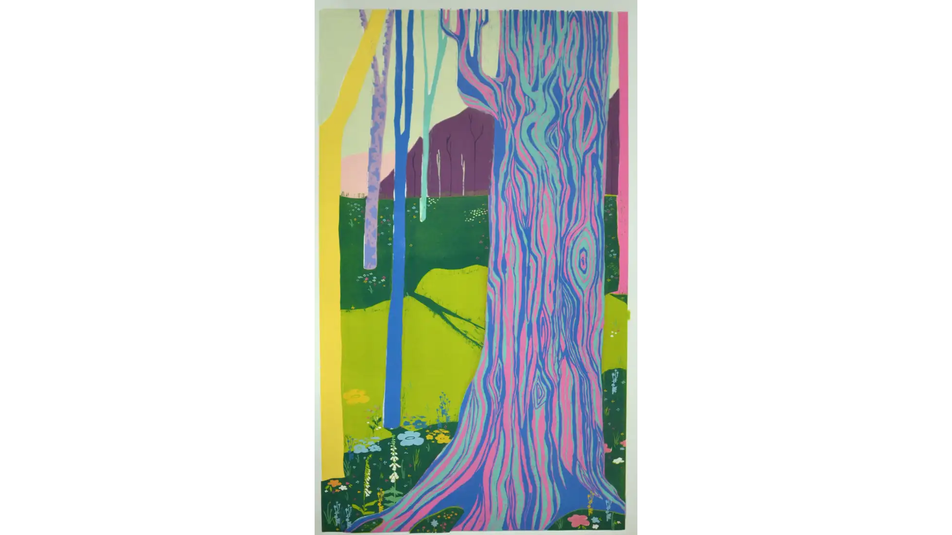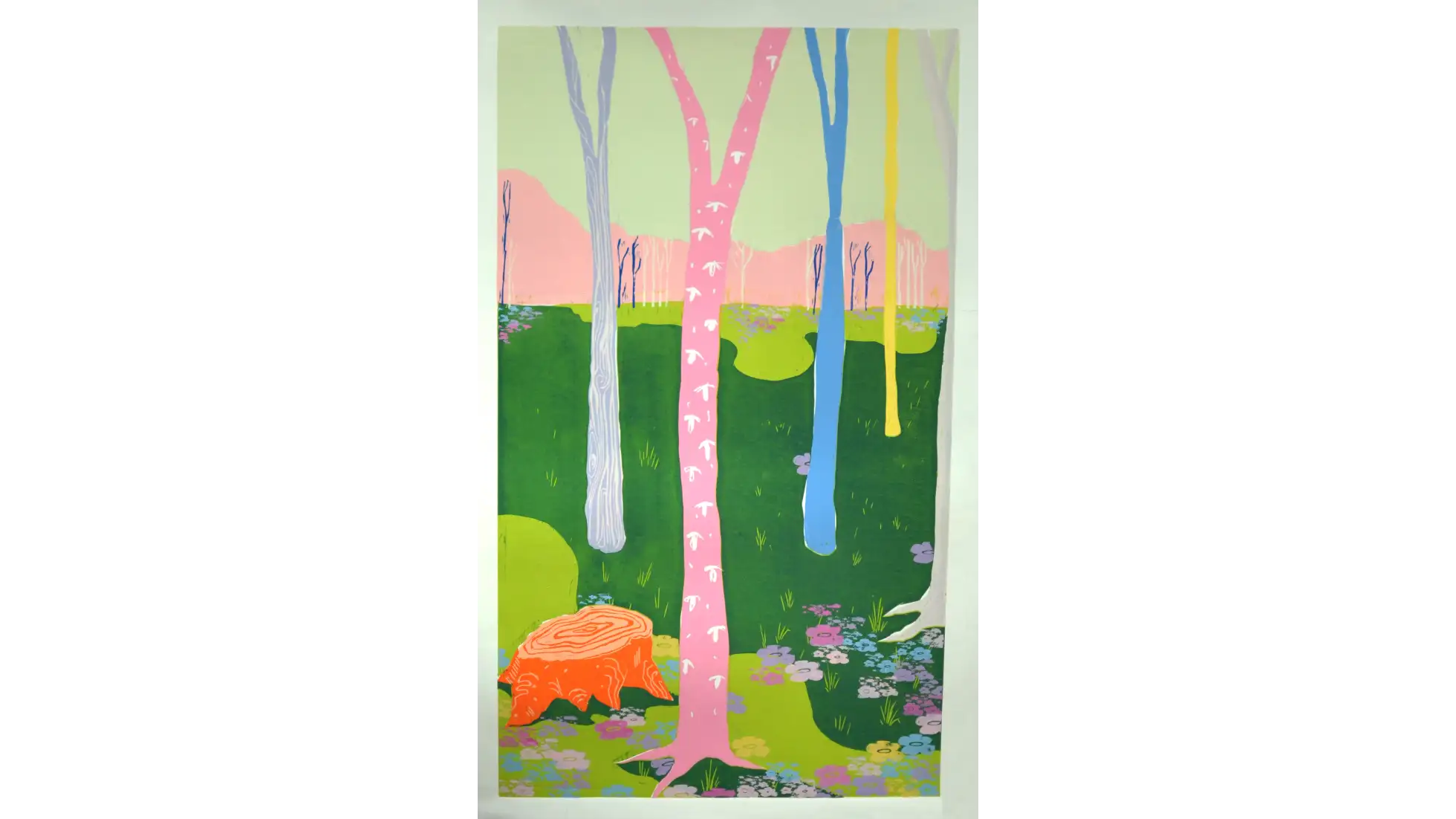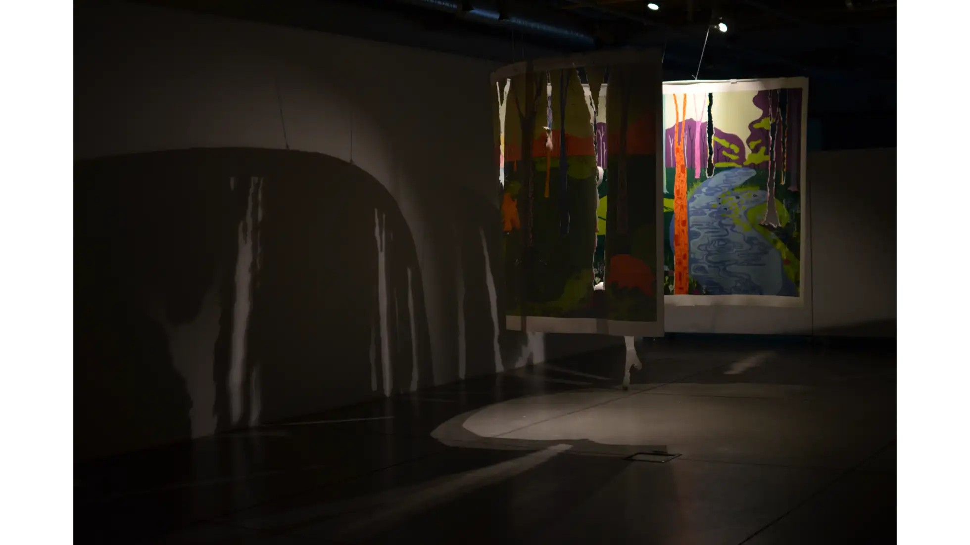 Lasy i Drzewa, kiedy znikają, stają się nie-miejscem. Faktem jest znikanie Lasów z otoczenia, ale nie z ludzkiej pamięci. Las stający się nie-miejscem, w momencie zniknięcia z krajobrazu i zastąpienia go blokiem, centrum handlowym, parkingiem etc. nie znika całkowicie - zostaje we wspomnieniach osób, które go widziały, żyły w jego otoczeniu. Las mógł zniknąć fizycznie, ale paradoksalnie nadal istnieje w tym samym miejscu, z którego został zabrany - dzięki pamięci. W pracy praktycznej stworzyłam przestrzeń, Las wyczuwalny w białych ścianach galerii. Zdecydowałam się na formę zaokrąglonej panoramy, która najlepiej pozwoli odbiorcom poczuć się jak w Lesie. Wybrany fragment pejzażu jest połączeniem kilku widoków, które są dla mnie szczególnie ważne lub po prostu szczególnie piękne. Na podstawie wykonanych zdjęć dokonałam syntezy pejzażu, a w kolorystyce odeszłam całkowicie od spokojnych brązów i zieleni, na rzecz nasyconych, jaskrawych kolorów, inspirowanych malarstwem Davida Hockneya. Ma ona wprowadzić do pejzażu element fantastyczności, który w tym kontekście oznacza coś nadzwyczajnego, wspaniałego. Kształty i plamy, których używam, nawiązują także do malarstwa ekspresjonistycznego, będącego dla mnie najlepszym wzorem, jeśli chodzi o pokazanie dynamiki, życia. Nie-miejsca są przedstawione w pracy jako cienie, rzucane na ścianę przez wyrwane w pracy pustki po Drzewach, tworząc tym samym fizyczną projekcję abstrakcyjnego pojęcia jakim jest Nie-Miejsce.