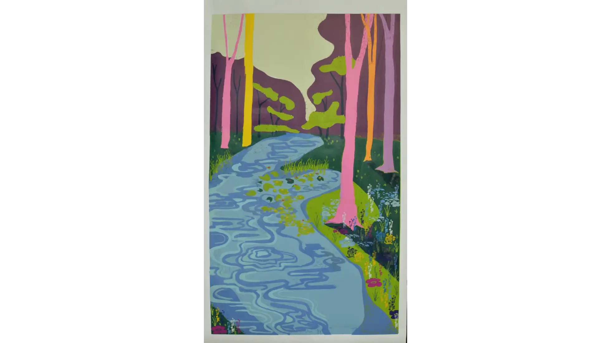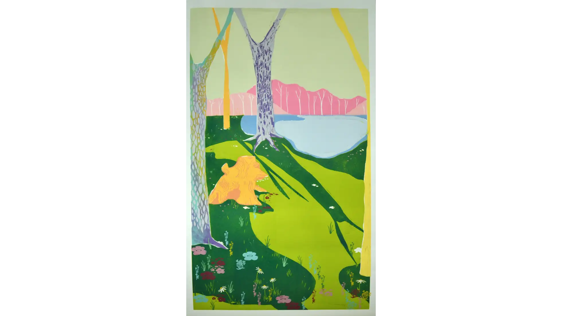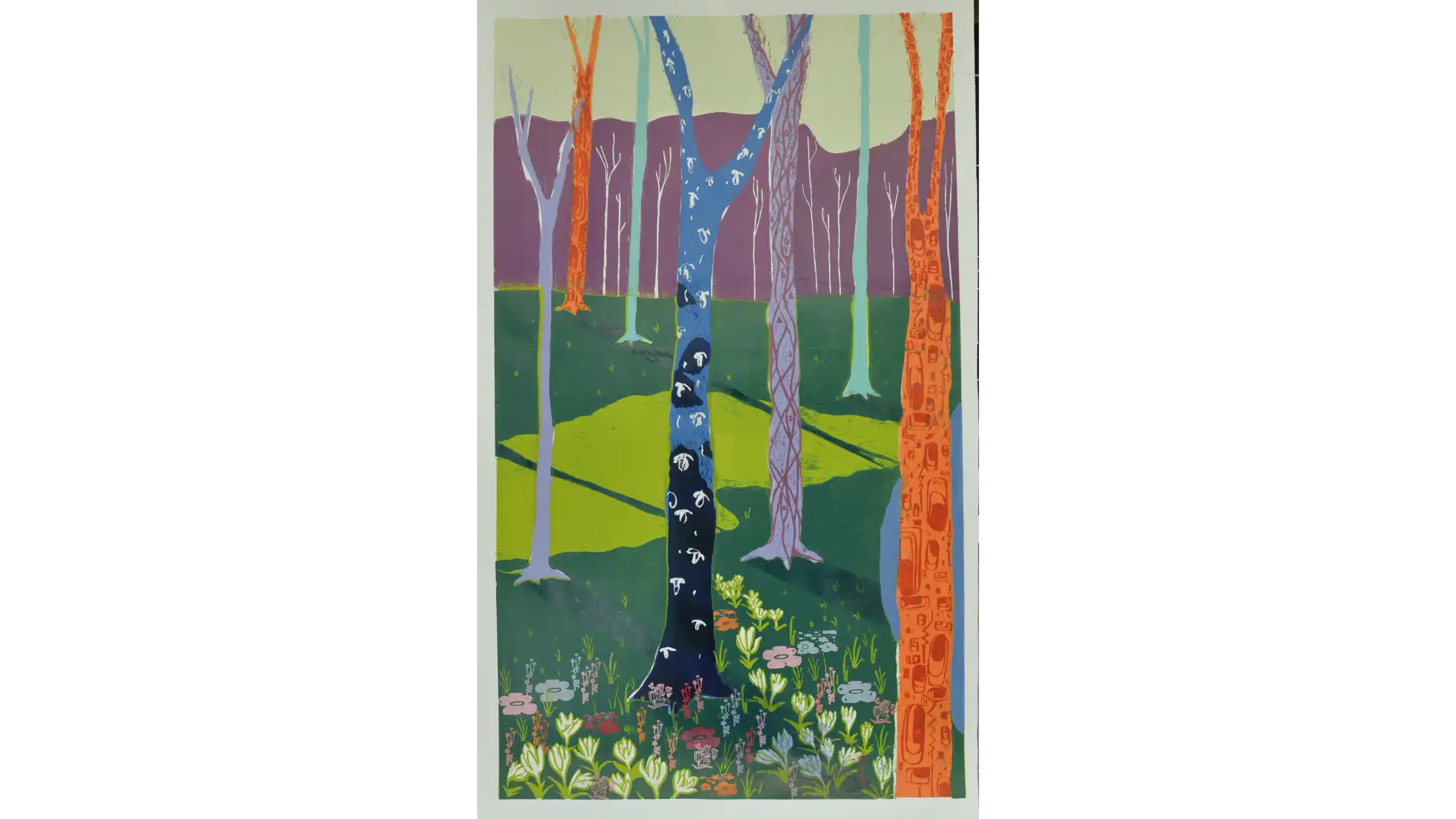 Lasy i Drzewa, kiedy znikają, stają się nie-miejscem. Faktem jest znikanie Lasów z otoczenia, ale nie z ludzkiej pamięci. Las stający się nie-miejscem, w momencie zniknięcia z krajobrazu i zastąpienia go blokiem, centrum handlowym, parkingiem etc. nie znika całkowicie - zostaje we wspomnieniach osób, które go widziały, żyły w jego otoczeniu. Las mógł zniknąć fizycznie, ale paradoksalnie nadal istnieje w tym samym miejscu, z którego został zabrany - dzięki pamięci. W pracy praktycznej stworzyłam przestrzeń, Las wyczuwalny w białych ścianach galerii. Zdecydowałam się na formę zaokrąglonej panoramy, która najlepiej pozwoli odbiorcom poczuć się jak w Lesie. Wybrany fragment pejzażu jest połączeniem kilku widoków, które są dla mnie szczególnie ważne lub po prostu szczególnie piękne. Na podstawie wykonanych zdjęć dokonałam syntezy pejzażu, a w kolorystyce odeszłam całkowicie od spokojnych brązów i zieleni, na rzecz nasyconych, jaskrawych kolorów, inspirowanych malarstwem Davida Hockneya. Ma ona wprowadzić do pejzażu element fantastyczności, który w tym kontekście oznacza coś nadzwyczajnego, wspaniałego. Kształty i plamy, których używam, nawiązują także do malarstwa ekspresjonistycznego, będącego dla mnie najlepszym wzorem, jeśli chodzi o pokazanie dynamiki, życia. Nie-miejsca są przedstawione w pracy jako cienie, rzucane na ścianę przez wyrwane w pracy pustki po Drzewach, tworząc tym samym fizyczną projekcję abstrakcyjnego pojęcia jakim jest Nie-Miejsce.