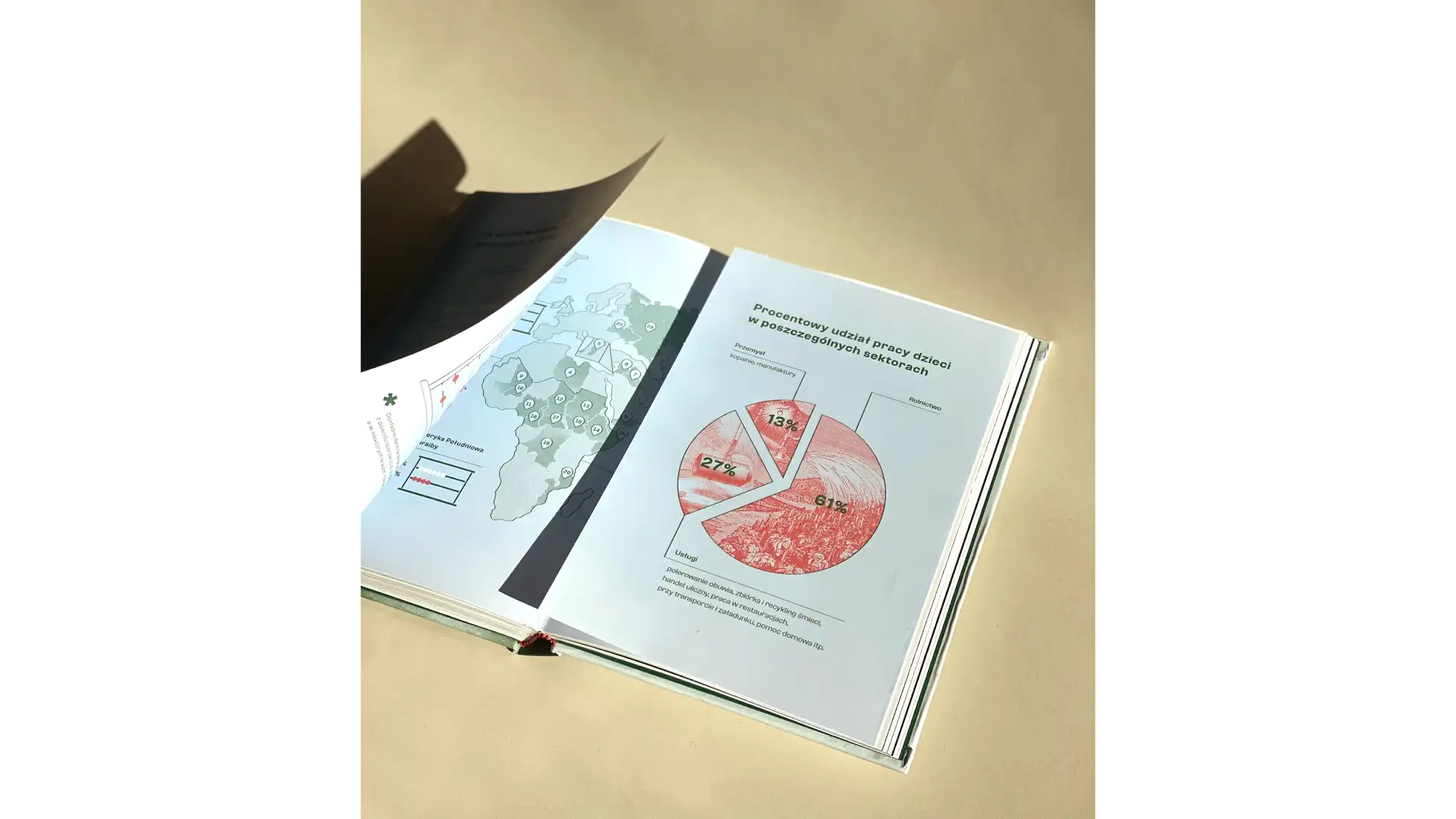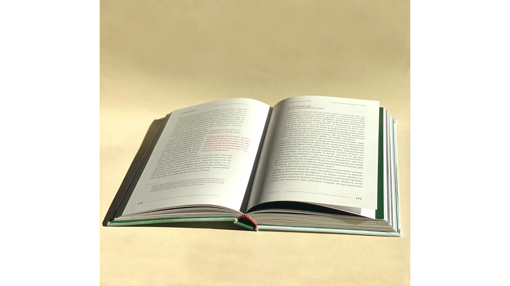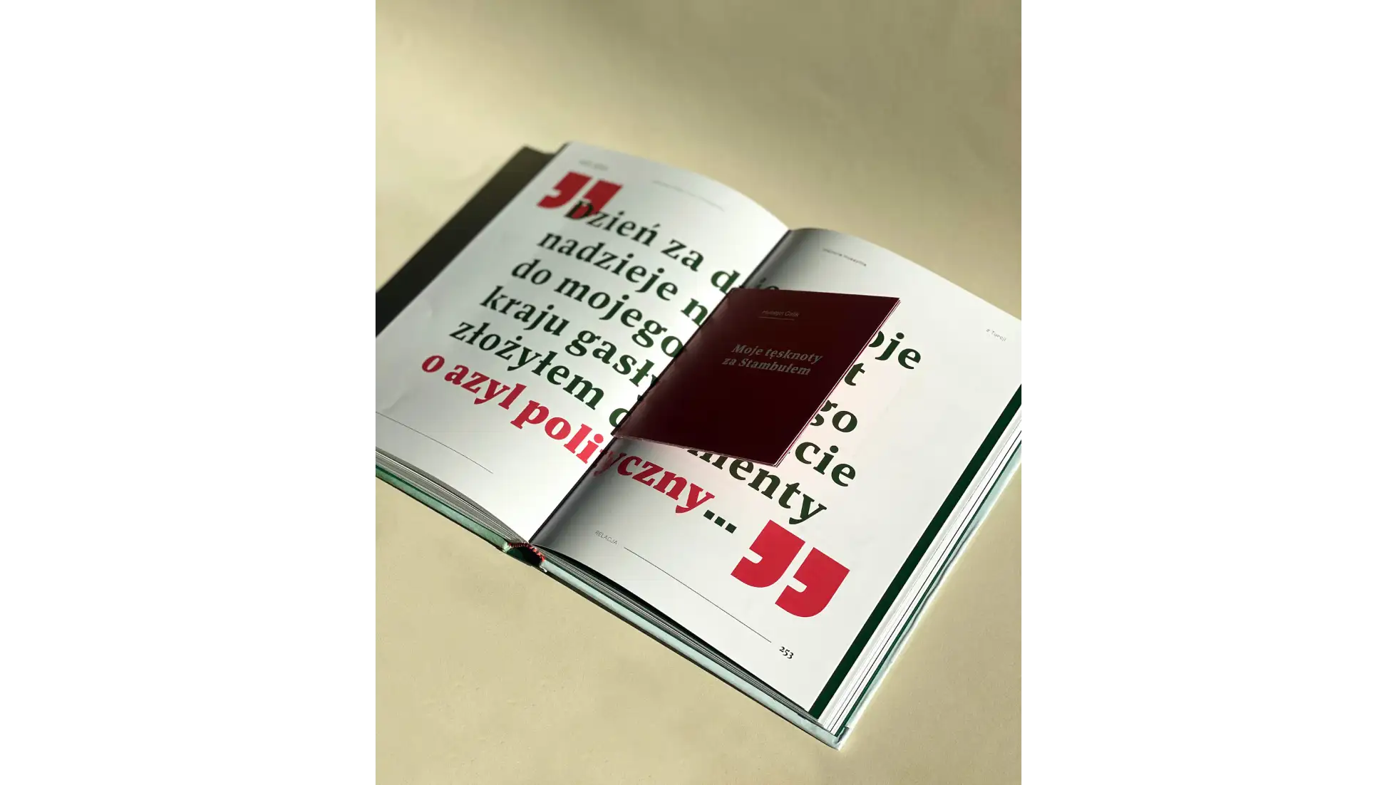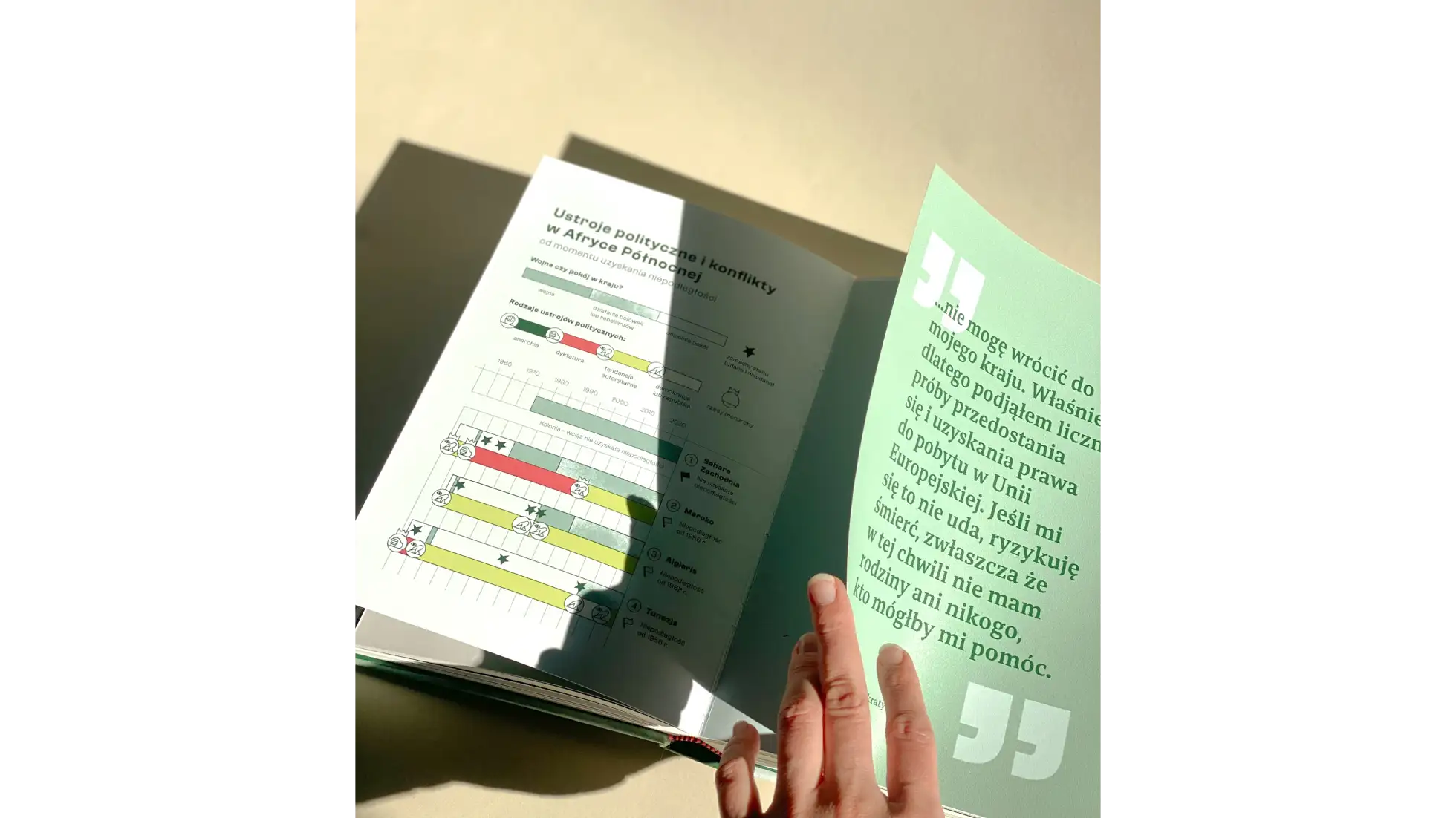 Książka powstała w celu przełamywania stereotypów o migrantach, wyjaśnianiu w czytelny sposób, jakie prawa im przysługują oraz nakreślania przyczyn migracji. Najważniejsze fragmenty historii zostały ukazane za pomocą przeskalowanej białej typografii na ciemnozielonych stronach oraz dopełnione krwistoróżowymi elementami graficznymi, wskazującymi na najbardziej dosadną treść. Projekt oparto na fontach Clash Grotesk Variable oraz Bespoke Serif, dla body tekstu i przeskalowanej typografii. Całość została zachowana w barwach zieleni, dopełniona kontrastowym różowo-czerwonym kolorem oraz delikatnym błękitem. Na okładce wykorzystano fotografię przedstawicielki jednej z kultur Malezji, wpatrującej się w czytelnika, rzucając mu wyzwanie do zmierzenia się ze zrozumieniem zjawiska migracji i otwarciem się na ludzi pochodzących spoza Europy. Bogata kolorystyka i “przyjazne” ilustracje mają sprawiać wrażenie większej przystępności projektu, w kontrze do trudnego tematu jaki podejmuje.