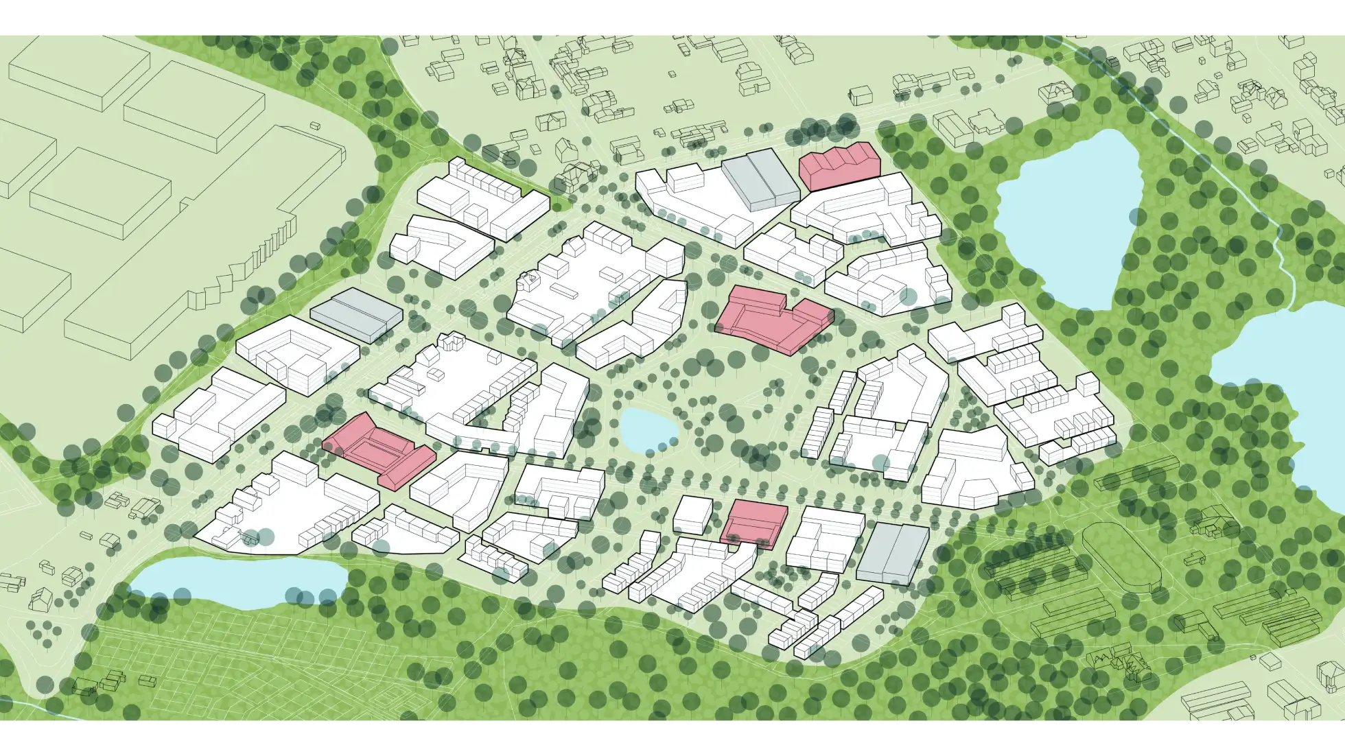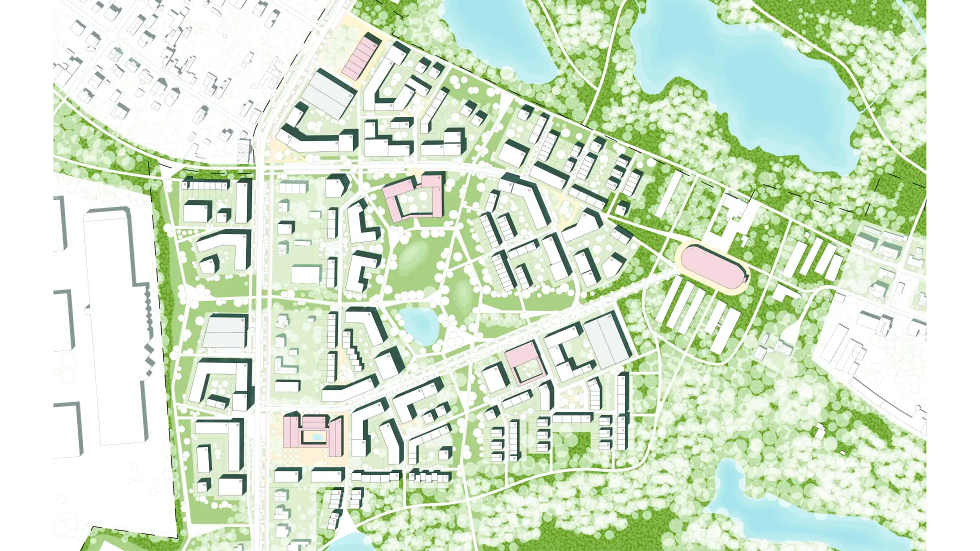 Projekt stanowi próbę przywrócenia peryferiom ich miejskiego znaczenia – jako przestrzeni, w której dawne funkcje przemysłowe, krajobraz przyrodniczy i współczesne potrzeby mieszkaniowe mogą współistnieć w zrównoważony sposób. Punkt wyjścia stanowi Rudnicze – południowo-zachodni skraj Poznania, gdzie pozostałości cegielni, dolina Junikowskiego Strumienia i rozproszona zabudowa tworzą niejednoznaczny, lecz pełen potencjału pejzaż. Część projektowa rozwija się etapowo: od opracowania ogólnych założeń funkcjonalno-przestrzennych i strategii zabudowy, przez koncepcję systemu zieleni oraz układu komunikacji, po projekt konkretnych zespołów urbanistycznych. Każdy z nich kształtuje spójną relację między przestrzenią publiczną a prywatną, wykorzystując lokalne walory krajobrazowe i istniejące struktury. Projekt dopełniają rozwiązania w najmniejszej skali – detale urbanistyczne, kompozycje ulic, wnętrz osiedlowych i terenów zieleni – nadające miejscu indywidualny charakter i kontynuujące jego materialne dziedzictwo. Projekt nie traktuje peryferii jako tła, lecz jako laboratorium współczesnego miasta – elastycznego, różnorodnego. Otwartego na przyszłość, ale nie zapominającego o swoich dziejach.