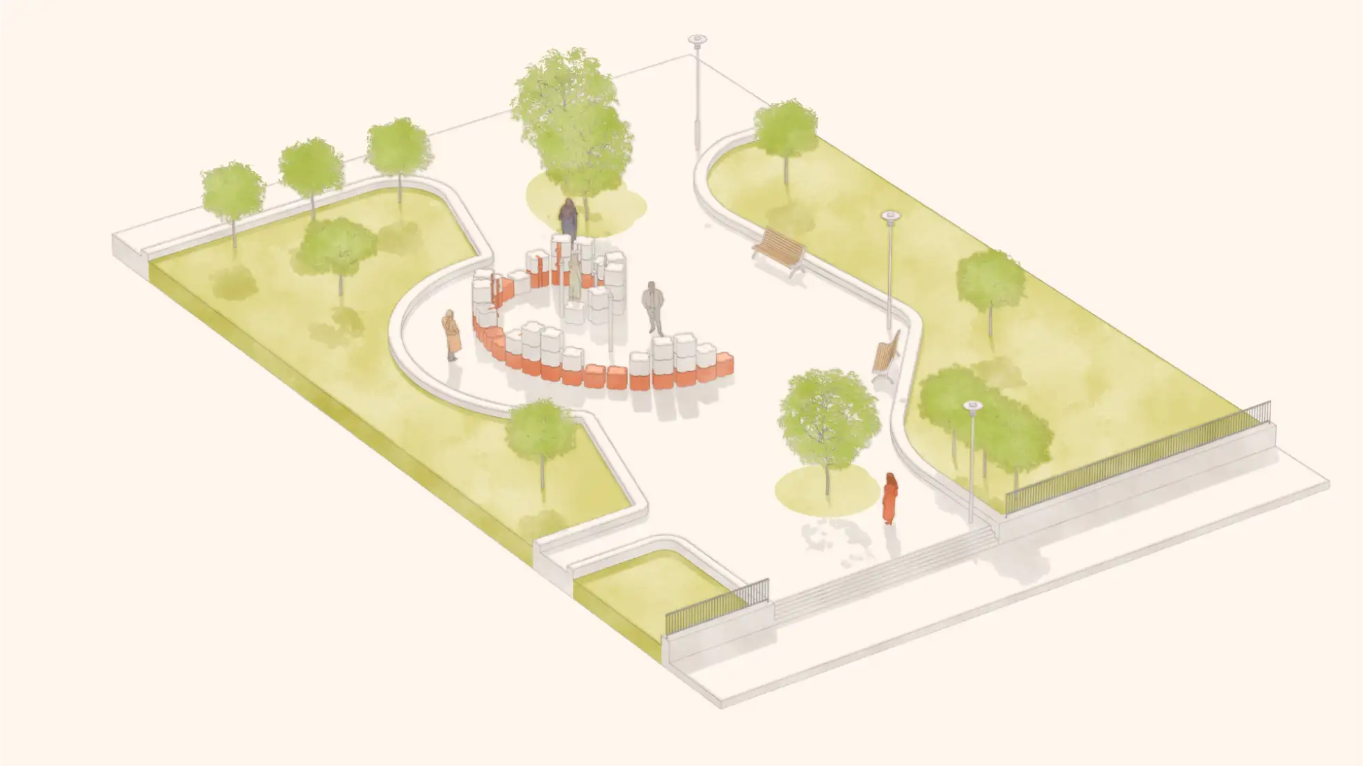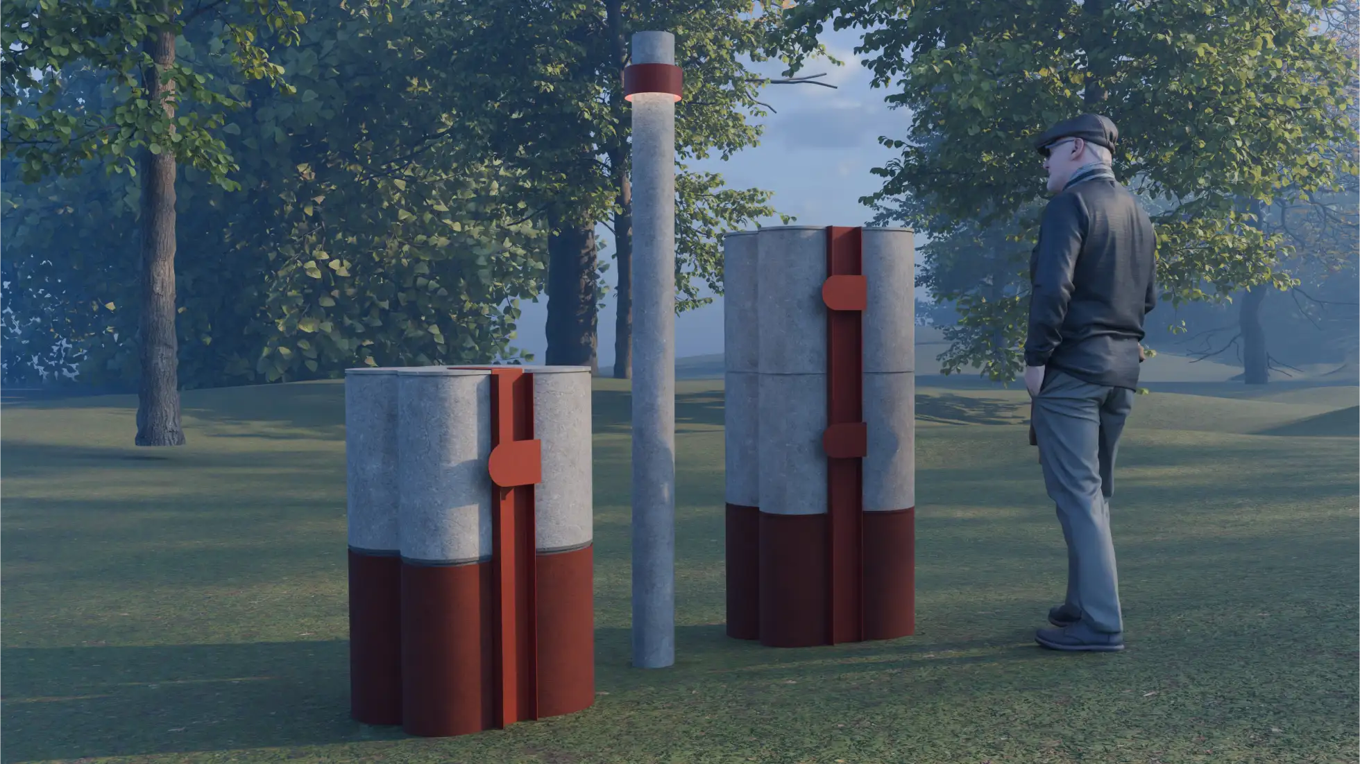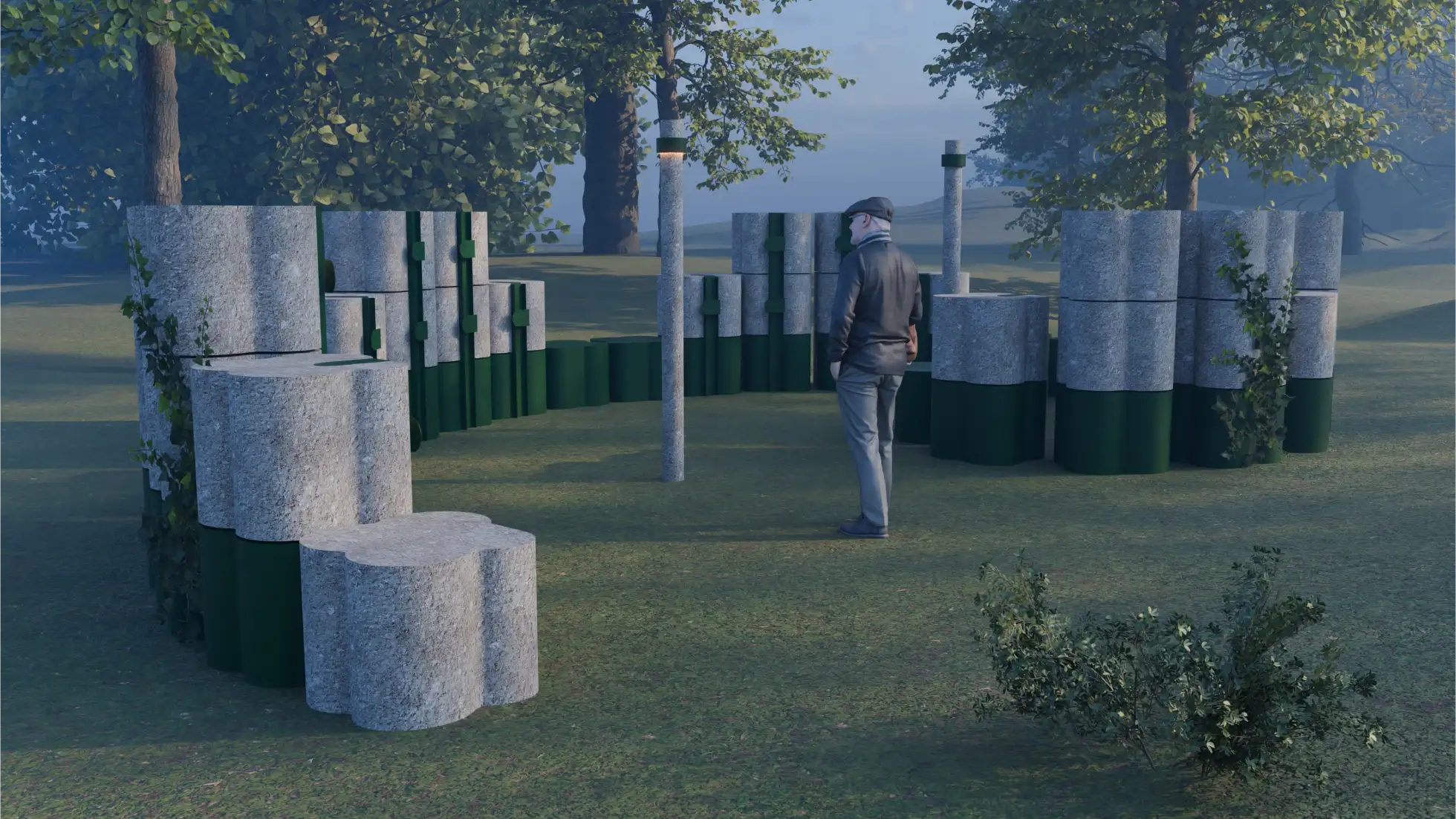 Współczesne polskie cmentarze nieczęsto odpowiadają na realne potrzeby użytkowników – emocjonalne i przestrzenne. Jednolite rzędy nagrobków, betonowe alejki i brak kontaktu z naturą sprawiają, że stają się miejscami wykluczającymi refleksję, wspólnotowość i indywidualną pamięć. Mój projekt podejmuje próbę redefinicji formy upamiętniania – stworzenia takiej, która łączy pamięć z życiem, zamiast izolować ją w przestarzałych rytuałach. Inspiracją były współczesne zmiany kulturowe, społeczne i ekologiczne w przeżywaniu żałoby. Coraz więcej osób poszukuje osobistych, symbolicznych i zrównoważonych form upamiętnienia, które lepiej odpowiadają na potrzeby współczesności. Projektowany modułowy nagrobek urnowy ma tworzyć przestrzeń, która jest nie tylko miejscem pochówku, ale też symboliczną formą obecności zmarłych w świecie żywych. Modułowość pozwala na elastyczne komponowanie przestrzeni – indywidualnej lub wspólnotowej. Każdy moduł stanowi samodzielną jednostkę pamięci, mogąc tworzyć większą strukturę zgodnie z rytmem potrzeb bliskich. Obłe, organiczne kształty mają charakter ponadreligijny i uniwersalny, sprzyjają integracji z krajobrazem oraz budowaniu przestrzeni skupienia i kontemplacji. Projekt proponuje nie tylko nową formę nagrobka, ale też nową wizję cmentarza – otwartego, społecznego, zintegrowanego z naturą. To próba zaprojektowania miejsca, które nie zatrzymuje się na śmierci, lecz przekłada ją na symboliczną obecność – cichą, wspólnotową i zakorzenioną w rytmie przyrody.