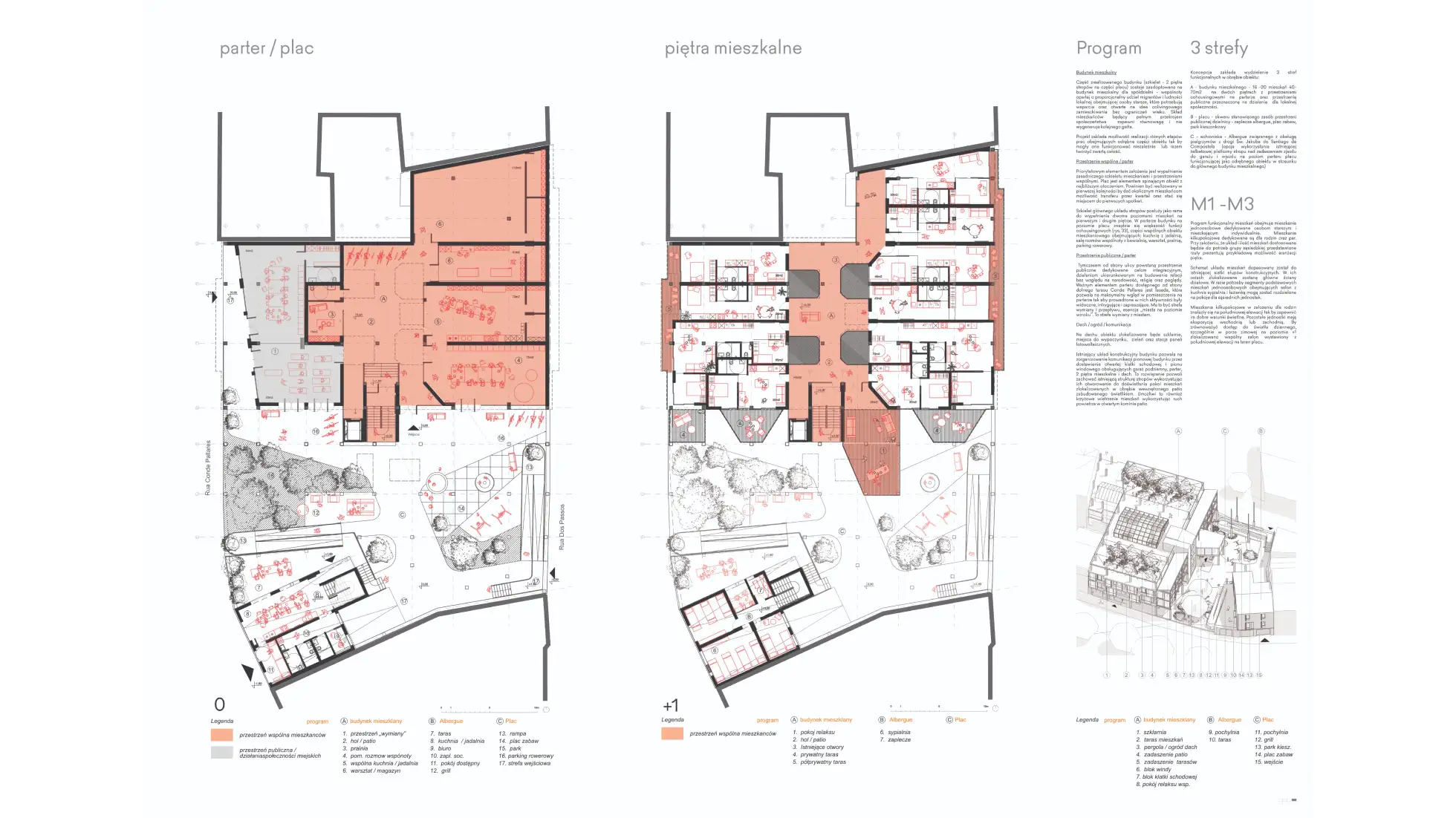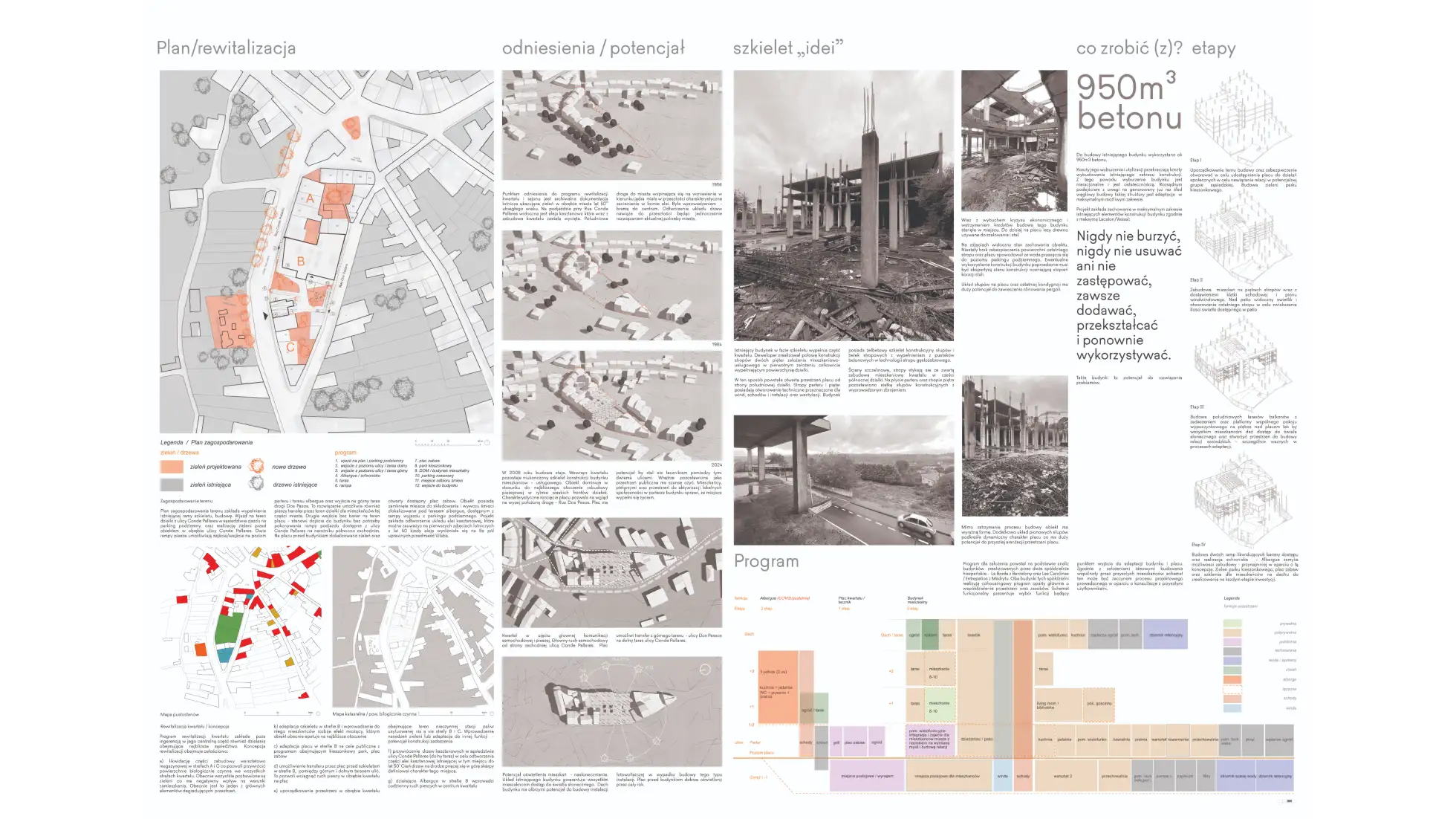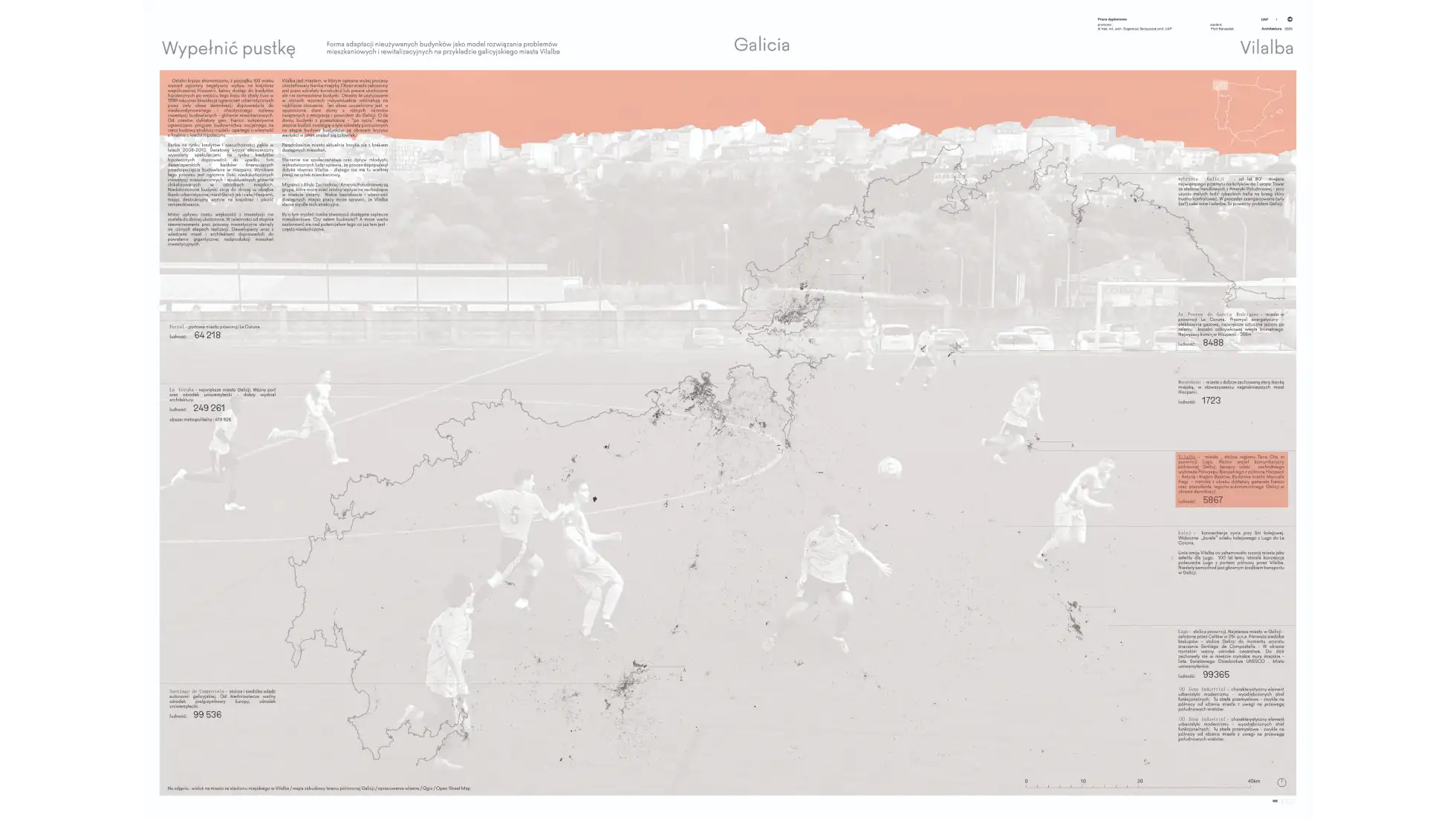 Kryzys ekonomiczny lat 2008–2010 zatrzymał w Hiszpanii największy spekulacyjny boom budowlany w Europie. Ogromna liczba inwestycji pozostała niedokończona, pozostawiając trwały ślad w krajobrazie. Postępująca depopulacja dodatkowo powiększa pulę pustostanów w małych galicyjskich miastach, takich jak Vilalba. Tę lukę mogą wypełnić jedynie migranci. Ich integracja i emancypacja wymagają jednak odpowiedniego modelu działania oraz zaplecza mieszkaniowego – tymczasem Hiszpania dysponuje jednym z najniższych w Europie zasobów mieszkań socjalnych. Koncentracja problemów społecznych w jednym miejscu prowadzi zwykle do negatywnych skutków. Projekt stanowi próbę wykorzystania nieukończonych budynków – pozostawionych na etapie konstrukcji – do celów mieszkaniowych. Kilka takich obiektów degraduje dziś historyczne centrum niewielkiego galicyjskiego miasta, położonego od średniowiecza na szlaku do Santiago de Compostela. W tym ujęciu architektura pokryzysowa może być potraktowana jako zasób. Adaptacja jednego z nieukończonych budynków może pomóc rozwiązać aktualne problemy miasta i przywrócić życie w wyludniającym się historycznym centrum. Modele mieszkaniowe oparte na idei cohousingu mogą wzmocnić procesy integracji i współdziałania pomiędzy migrantami a lokalną społecznością. Utopia? Jeśli nawet, to – warto marzyć.