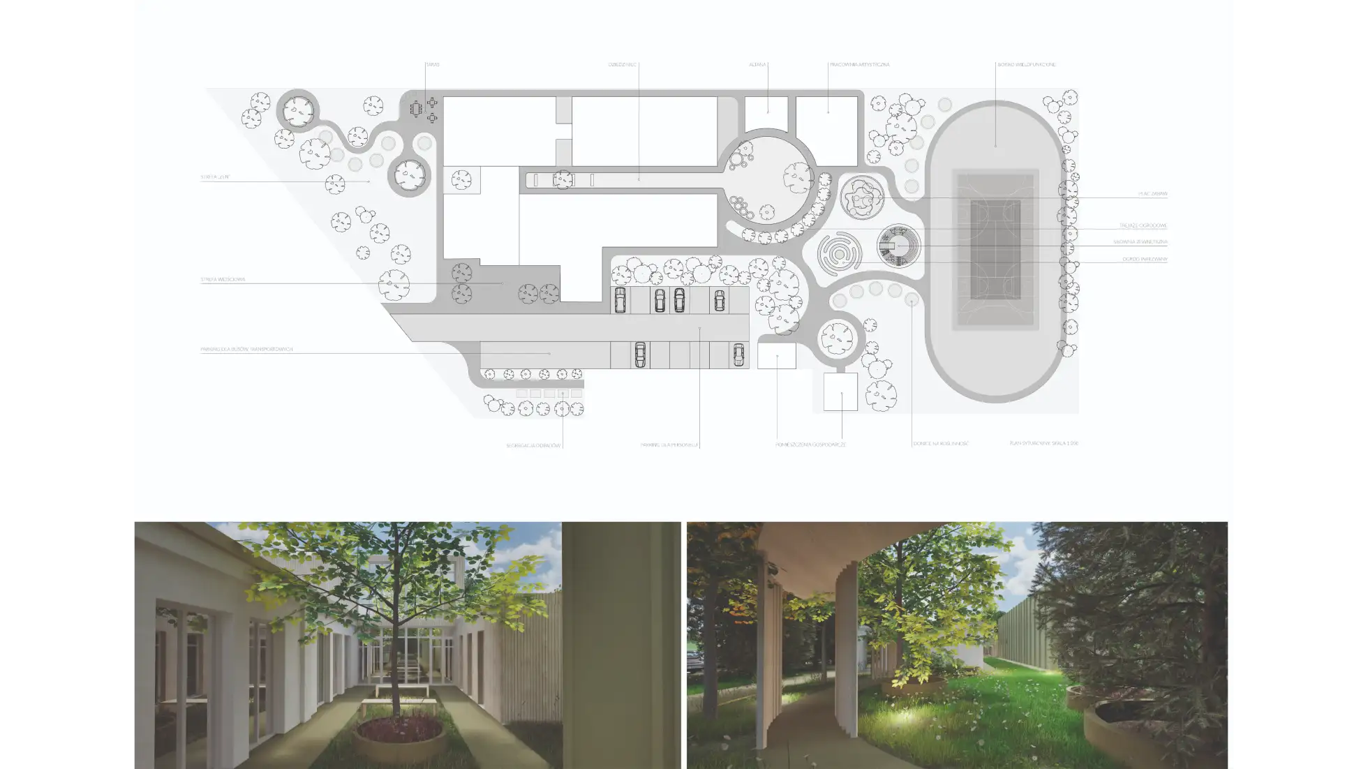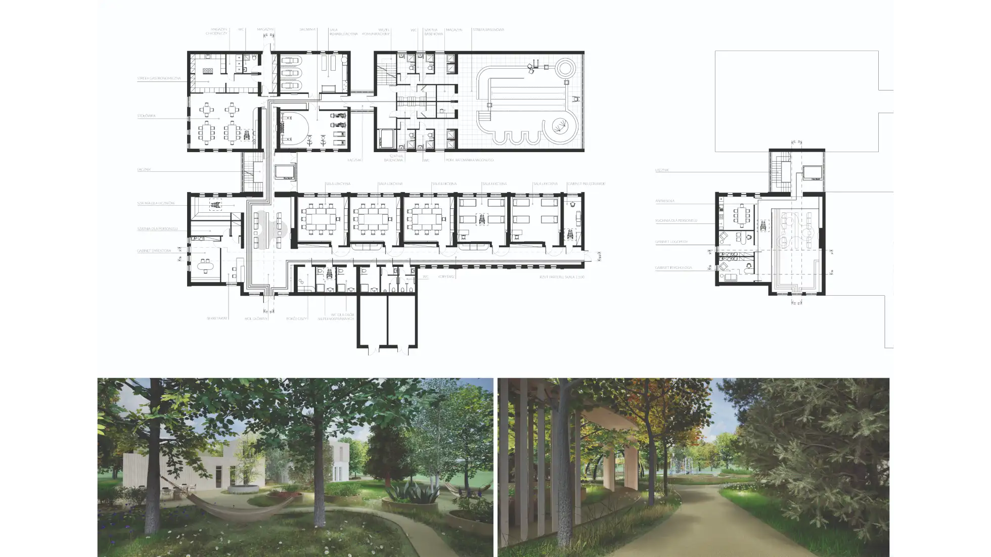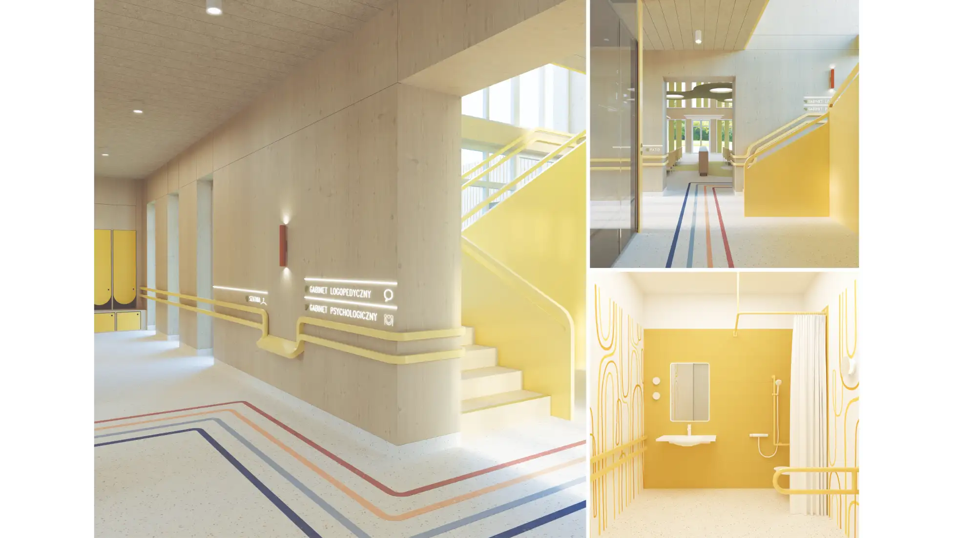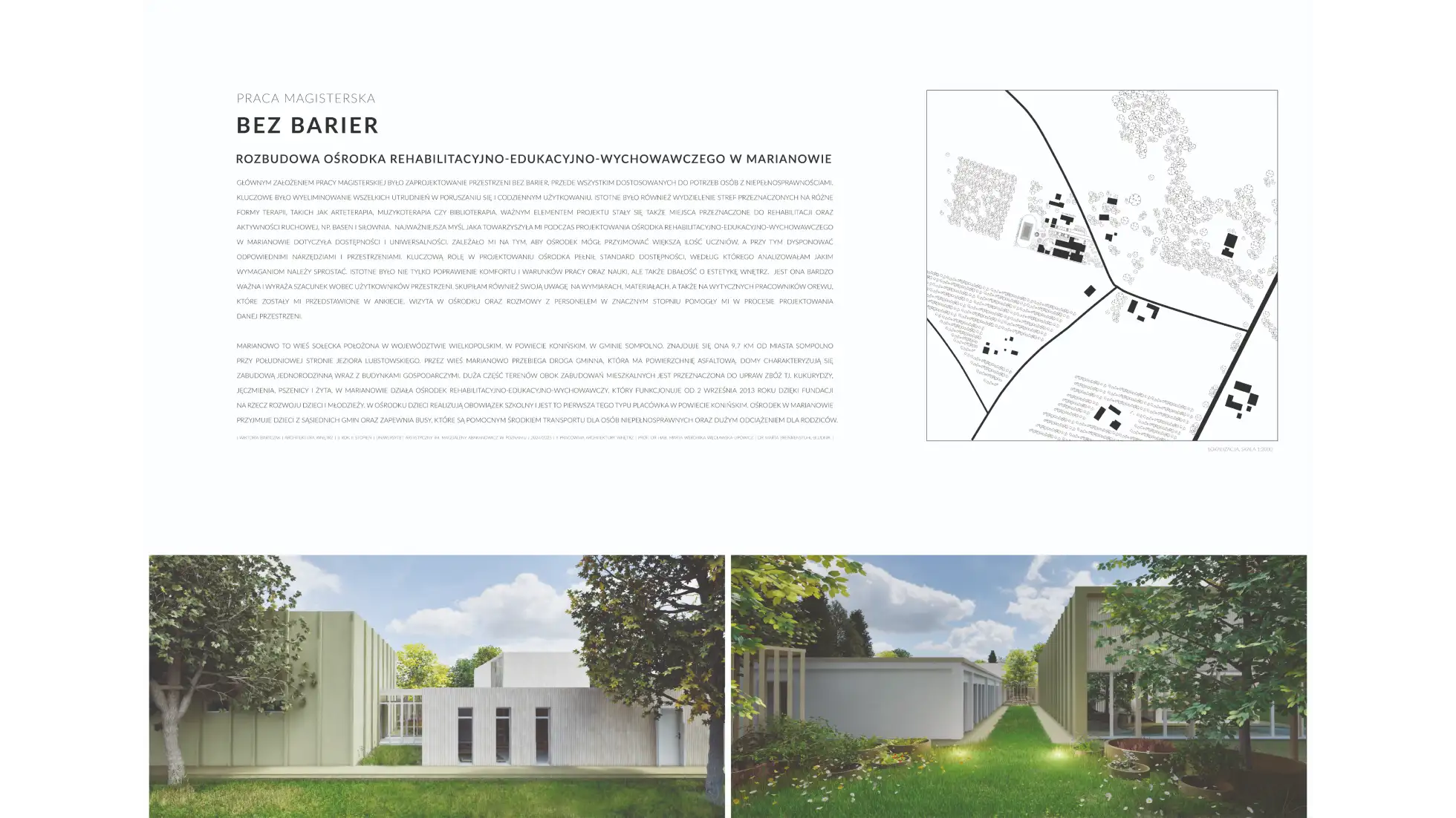 Praca dyplomowa dotyczy projektu wnętrz Ośrodka Rehabilitacyjno-Edukacyjno-Wychowawczego, którego celem jest stworzenie przestrzeni wspierającej rozwój, terapię i integrację osób z niepełnosprawnościami. Koncepcja zakłada połączenie funkcjonalności z estetyką, aby wnętrza sprzyjały zarówno procesowi rehabilitacji, jak i budowaniu poczucia bezpieczeństwa i komfortu użytkowników. W projekcie uwzględniono układ funkcjonalny obejmujący sale dydaktyczne, terapeutyczne, pomieszczenia administracyjne oraz strefy wspólne. Istotnym elementem obiektu są przestrzenie sportowo-rekreacyjne – basen, bieżnia i boisko wielofunkcyjne – które zostały zaprojektowane z myślą o rehabilitacji ruchowej oraz aktywności fizycznej dostosowanej do różnych grup wiekowych i poziomów sprawności. Ważnym założeniem było zapewnienie dostępności architektonicznej i wygodnej komunikacji wewnętrznej. Zastosowano materiały trwałe, łatwe w utrzymaniu i przyjazne sensorycznie, a także odpowiednie rozwiązania akustyczne i oświetleniowe wspierające koncentrację i komfort. Kolorystyka oraz detale wnętrz zostały dobrane tak, aby sprzyjały orientacji w przestrzeni, redukowały stres i motywowały do aktywności. Projekt łączy wymogi funkcjonalne, terapeutyczne i estetyczne, tworząc kompleksową przestrzeń rehabilitacyjno-edukacyjną, która odpowiada na potrzeby użytkowników.