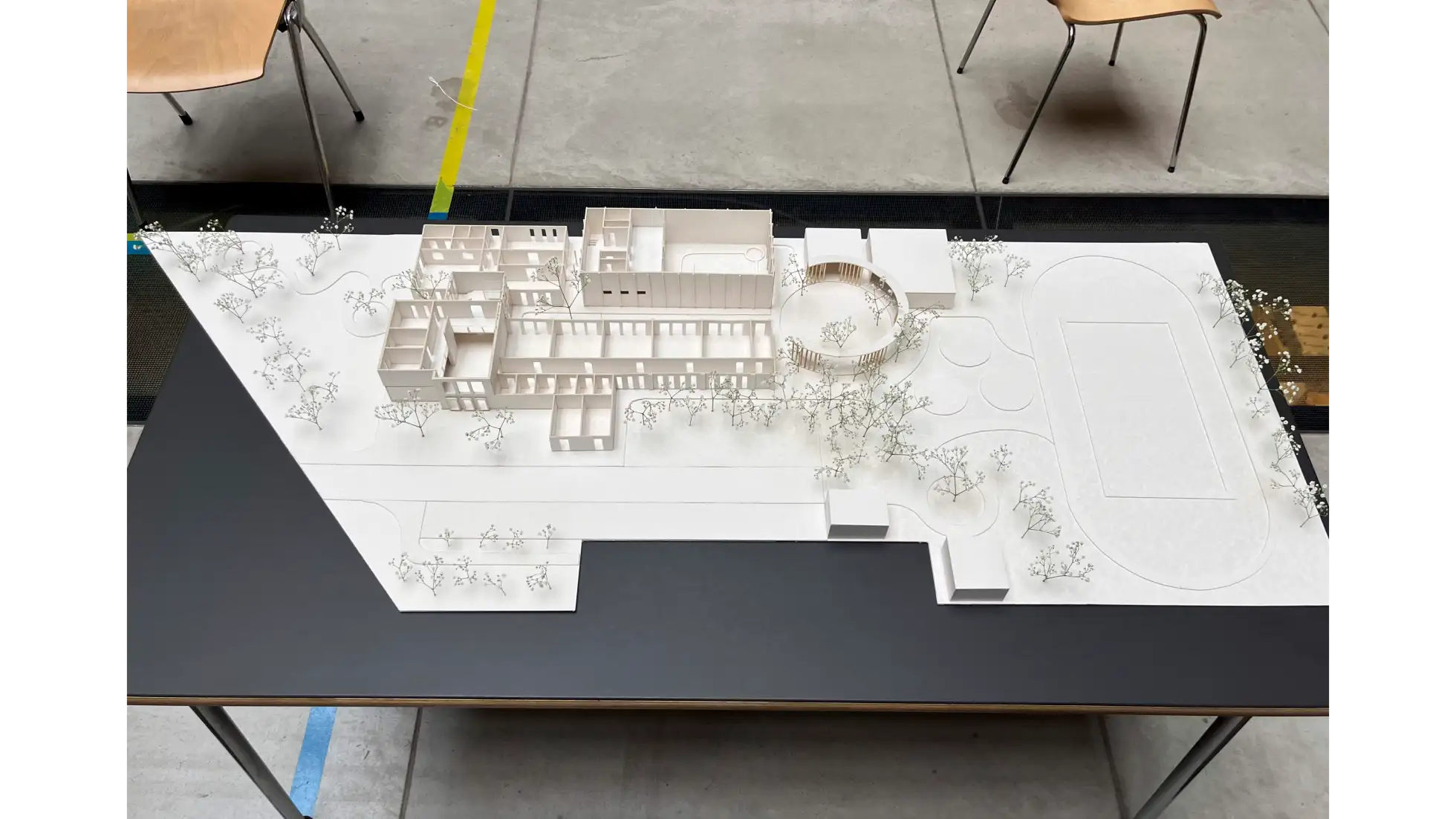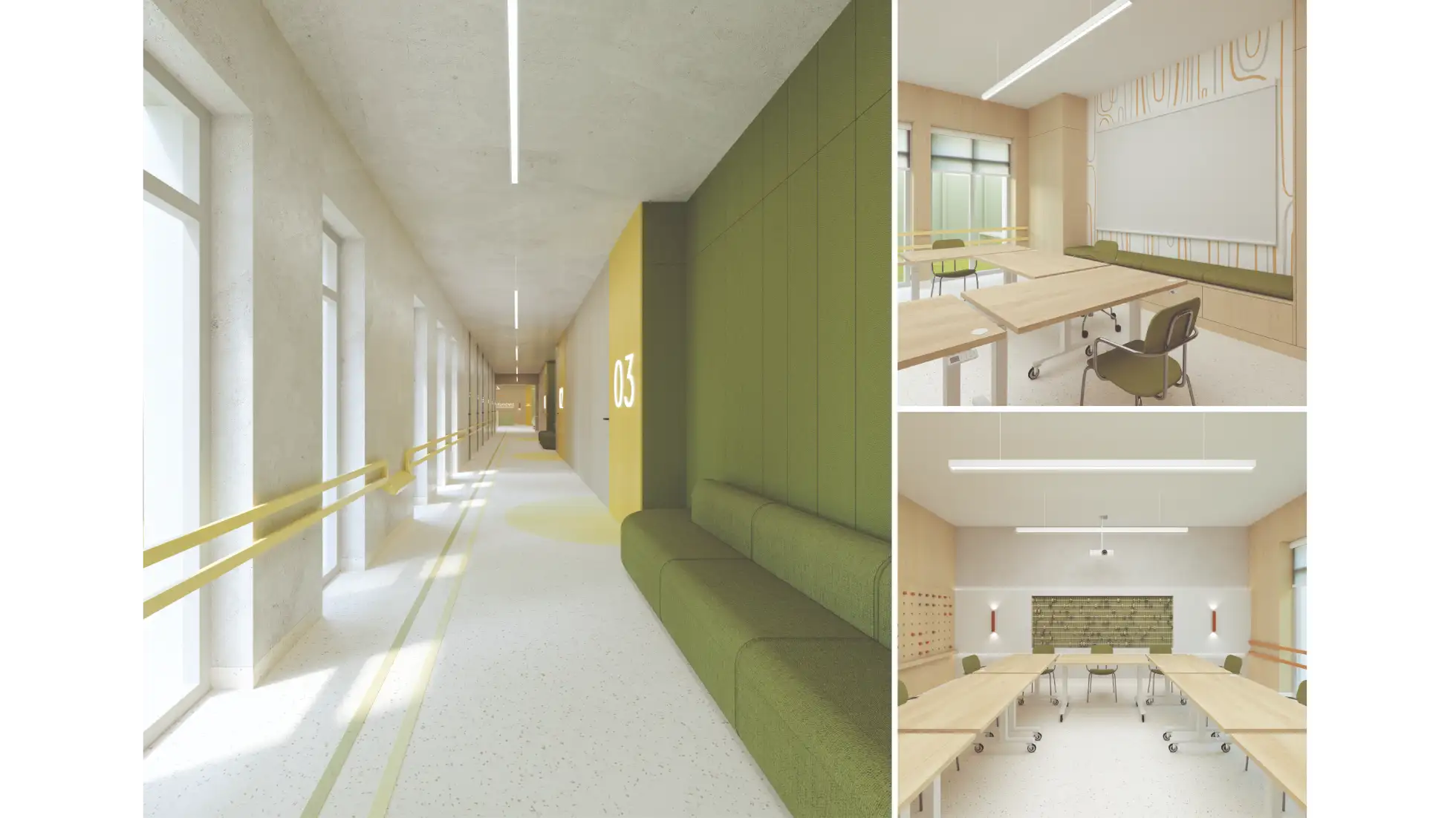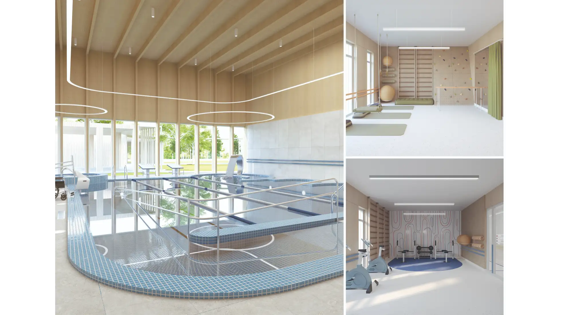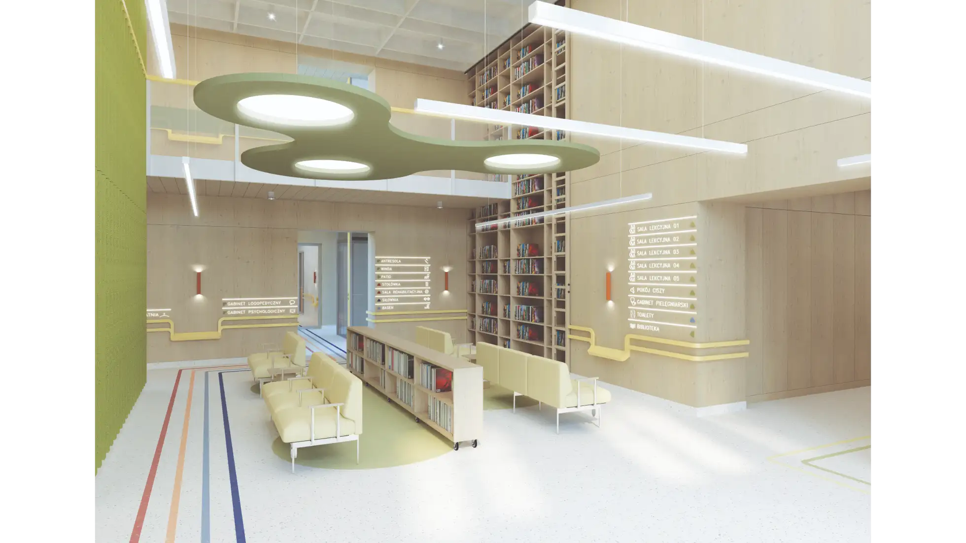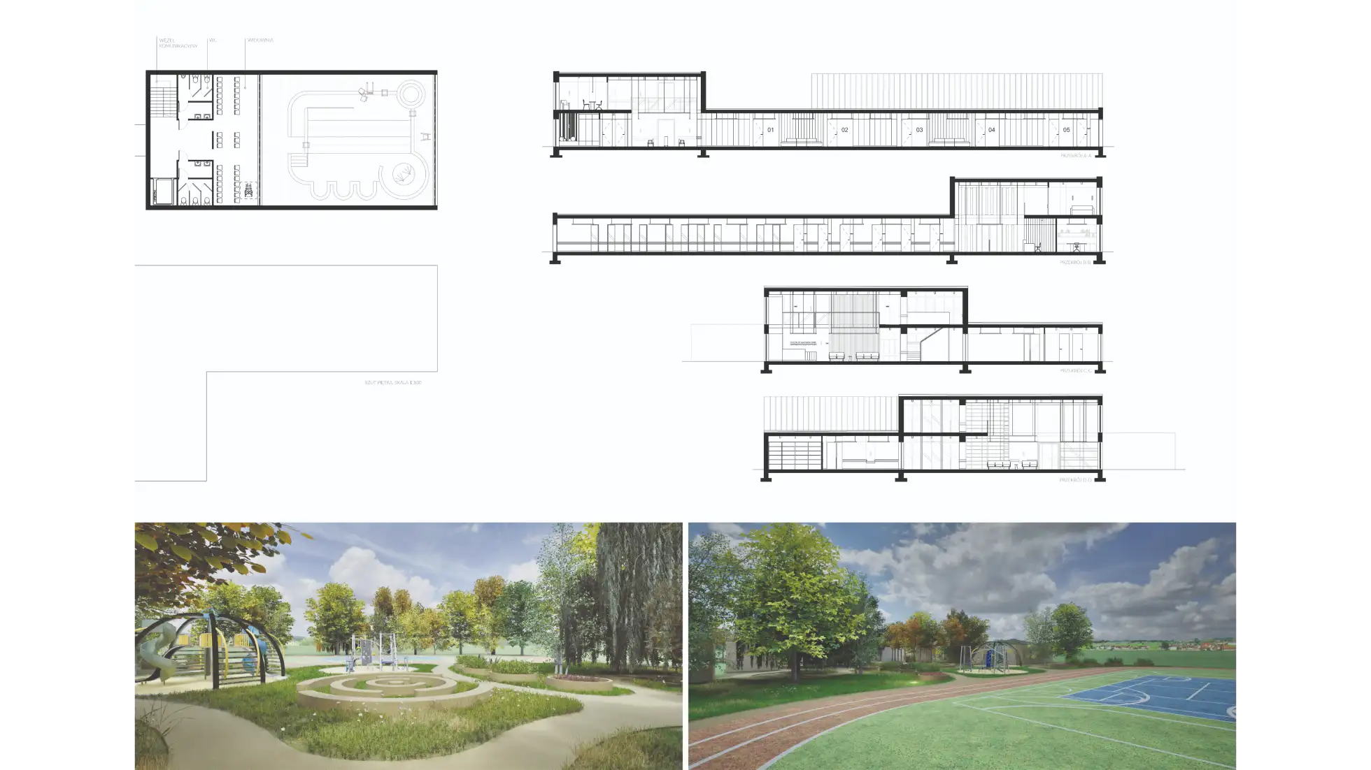 Praca dyplomowa dotyczy projektu wnętrz Ośrodka Rehabilitacyjno-Edukacyjno-Wychowawczego, którego celem jest stworzenie przestrzeni wspierającej rozwój, terapię i integrację osób z niepełnosprawnościami. Koncepcja zakłada połączenie funkcjonalności z estetyką, aby wnętrza sprzyjały zarówno procesowi rehabilitacji, jak i budowaniu poczucia bezpieczeństwa i komfortu użytkowników. W projekcie uwzględniono układ funkcjonalny obejmujący sale dydaktyczne, terapeutyczne, pomieszczenia administracyjne oraz strefy wspólne. Istotnym elementem obiektu są przestrzenie sportowo-rekreacyjne – basen, bieżnia i boisko wielofunkcyjne – które zostały zaprojektowane z myślą o rehabilitacji ruchowej oraz aktywności fizycznej dostosowanej do różnych grup wiekowych i poziomów sprawności. Ważnym założeniem było zapewnienie dostępności architektonicznej i wygodnej komunikacji wewnętrznej. Zastosowano materiały trwałe, łatwe w utrzymaniu i przyjazne sensorycznie, a także odpowiednie rozwiązania akustyczne i oświetleniowe wspierające koncentrację i komfort. Kolorystyka oraz detale wnętrz zostały dobrane tak, aby sprzyjały orientacji w przestrzeni, redukowały stres i motywowały do aktywności. Projekt łączy wymogi funkcjonalne, terapeutyczne i estetyczne, tworząc kompleksową przestrzeń rehabilitacyjno-edukacyjną, która odpowiada na potrzeby użytkowników.