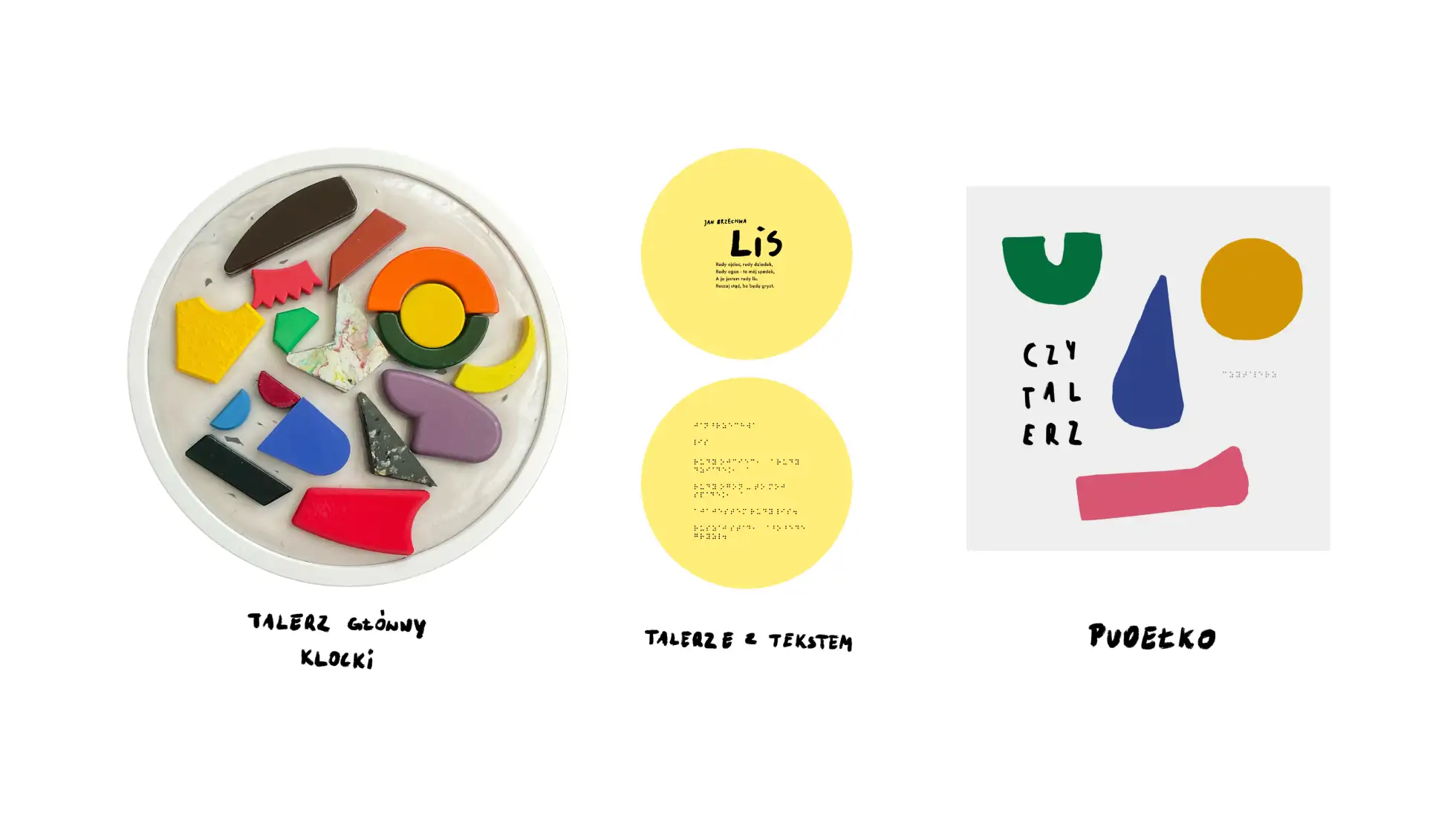 „Czytalerz” pozwala dziecku samodzielnie ilustrować historie za pomocą abstrakcyjnych klocków oraz talerza z powierzchnią sensoryczną, które pobudzają wyobraźnię i wspierają rozwój zmysłów. Klocki różnią się fakturą, temperaturą, kształtem i wagą, dzięki czemu mogą być różnie interpretowane zarówno przez dzieci widzące, jak i niewidome i słabowidzące, a wiersze umieszczone na talerzach występują również w alfabecie Braille’a. Projekt stanowi alternatywę dla biernej rozrywki ekranowej, oferując doświadczenie wspólnego tworzenia, opowiadania i odkrywania. Łączy funkcję edukacyjną, terapeutyczną i integracyjną, zachęcając do dialogu między dzieckiem a dorosłym oraz samymi dziećmi. Praca dyplomowa obejmuje również graficzną oprawę projektu – projekt pudełka oraz typografię.